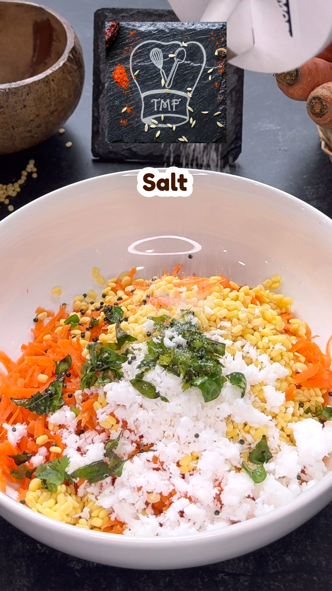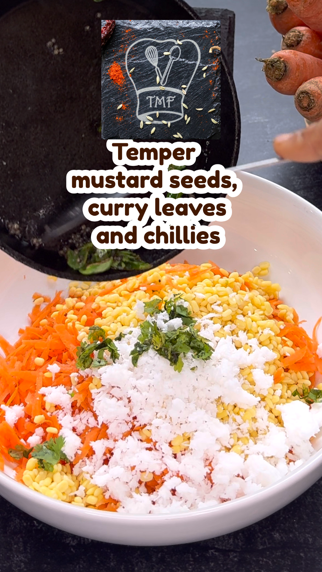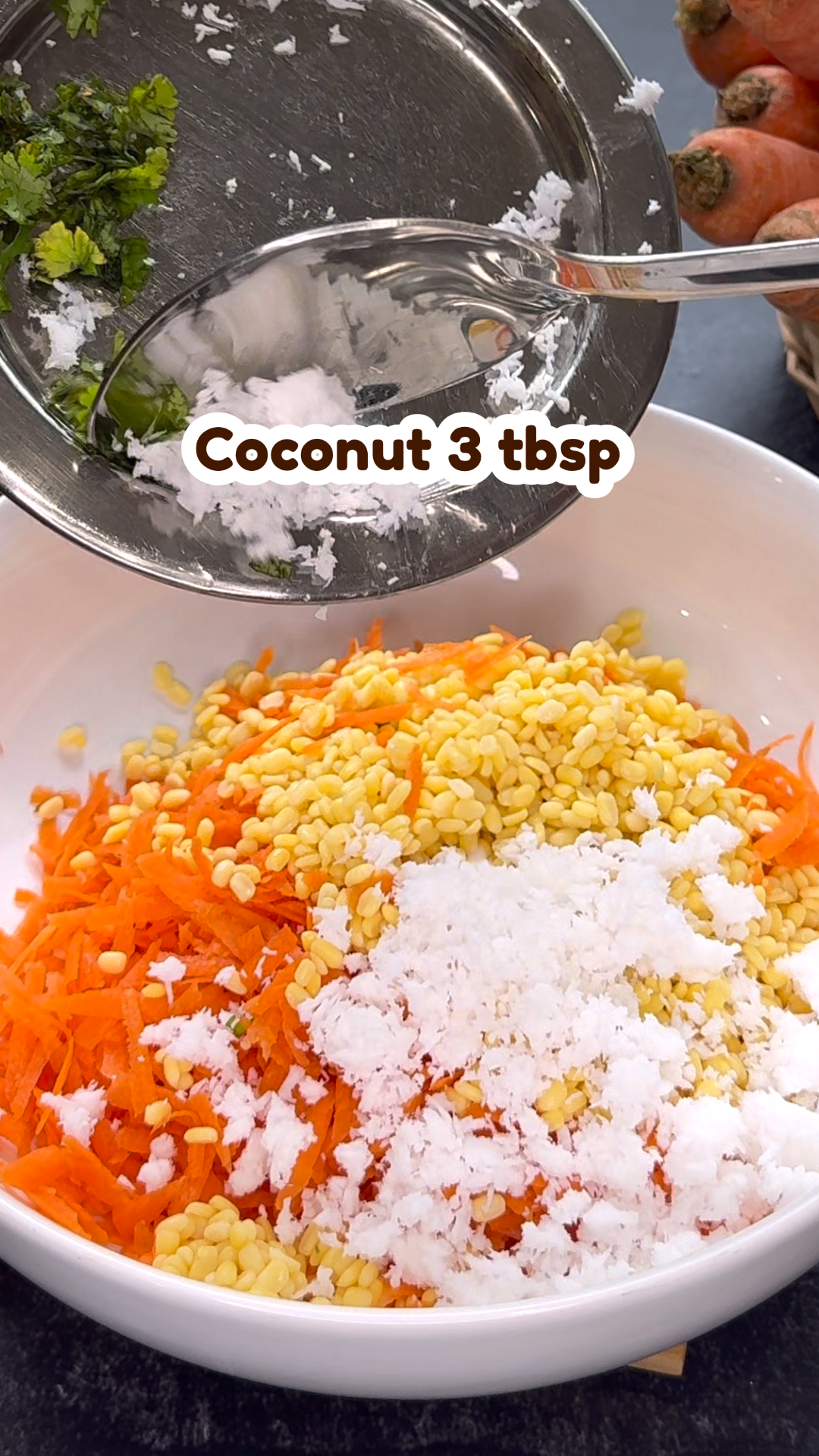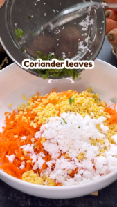 - Furthermore, add grated carrots, corainder leaves, and coconut; mix well