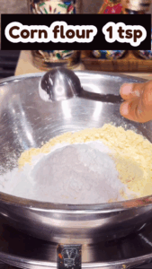 - In a mixing bowl, combine besan flour, rice flour, corn flour, salt, asafoetida, turmeric powder, Kashmiri chilli powder, and carom seeds.