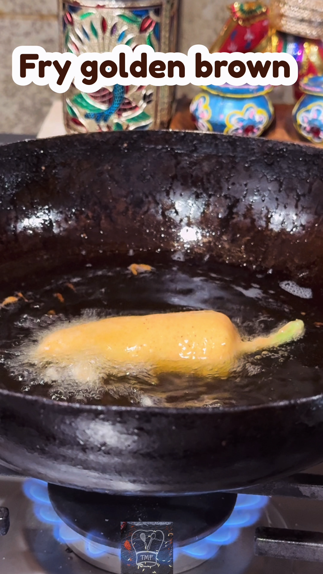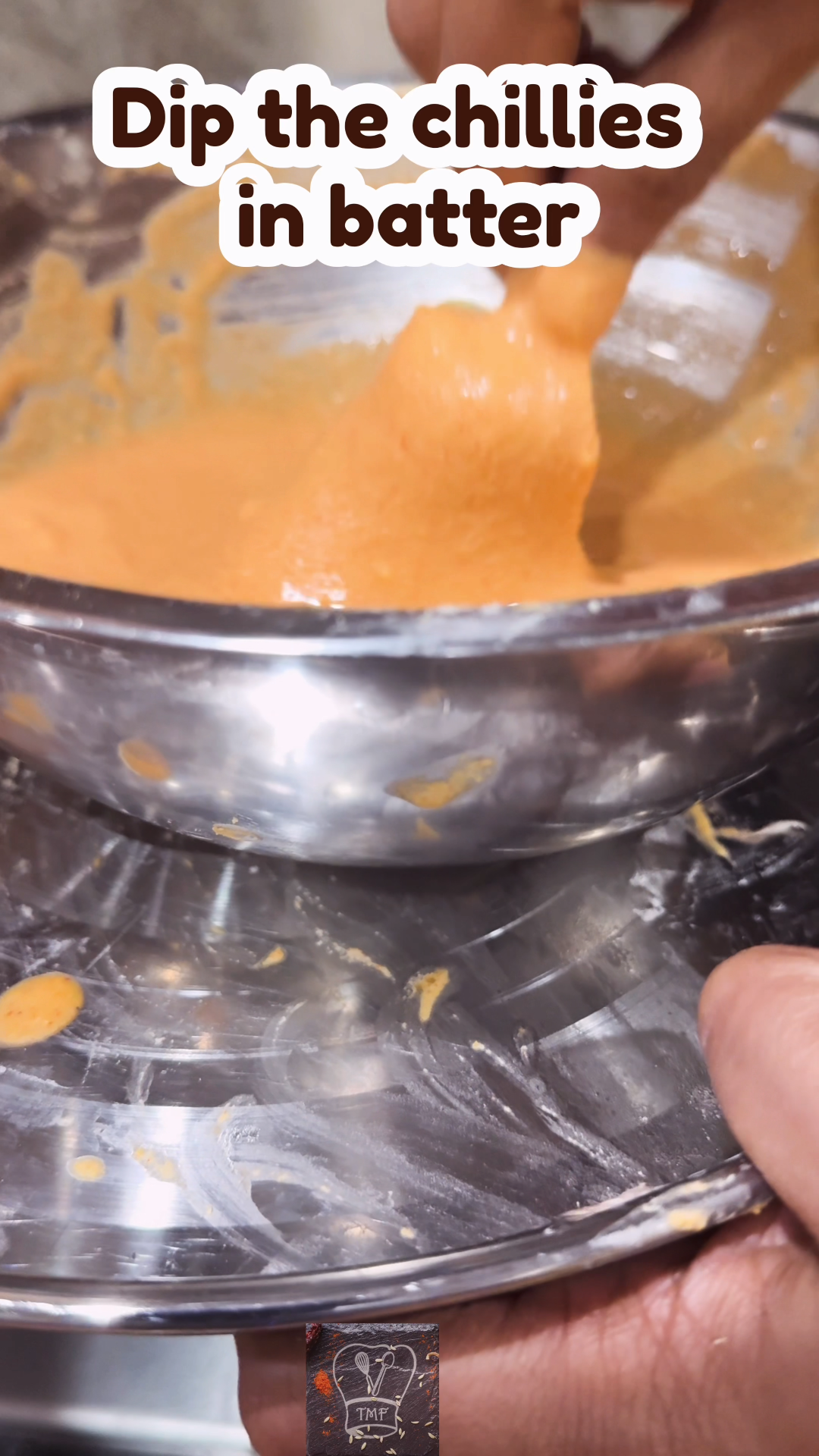 The batter should be slightly thick but pourable, similar to dosa batter. It must coat the chilli evenly without dripping too much.