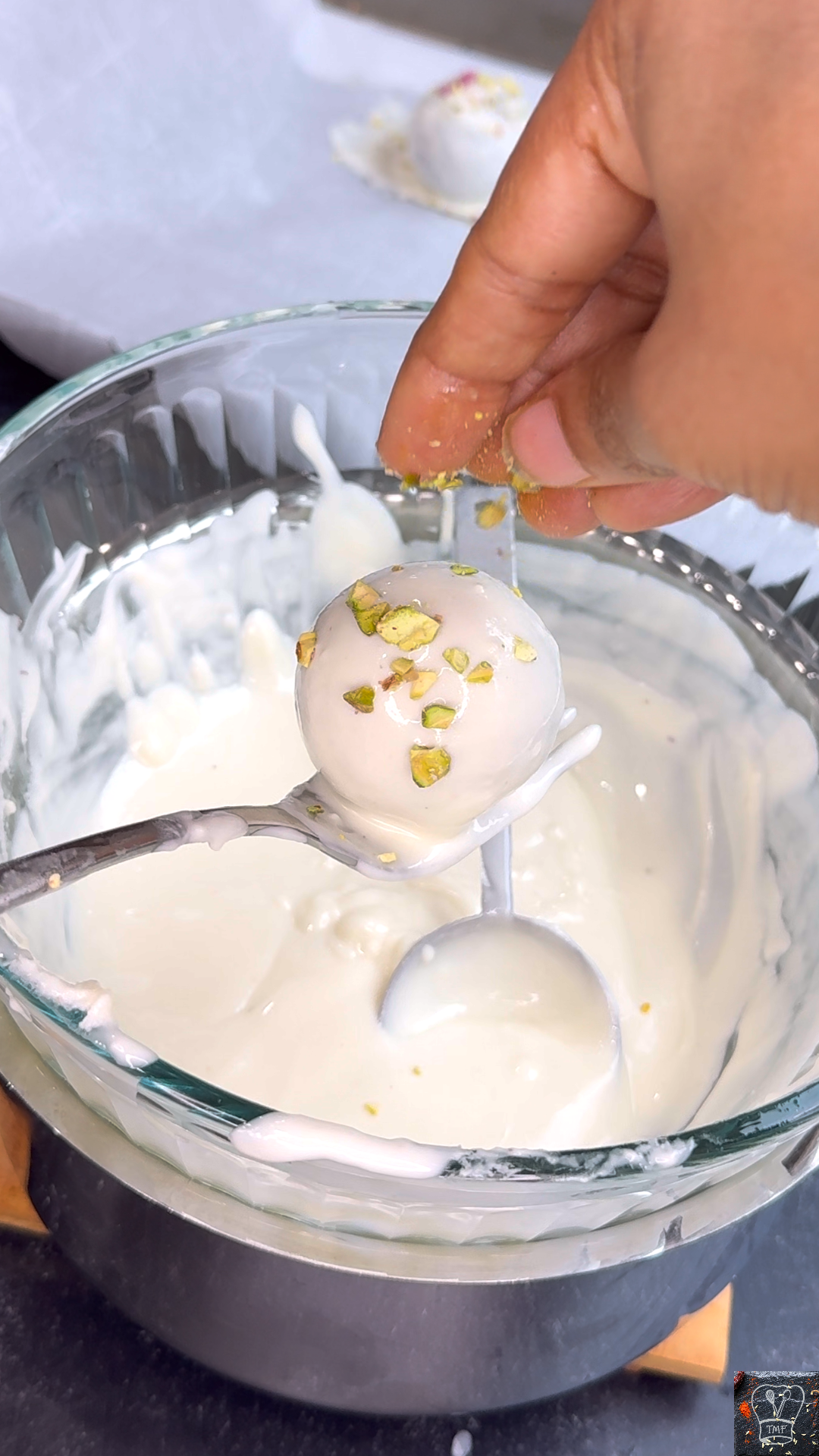 - Dip each frozen gulab jamun into the melted chocolate and coat well