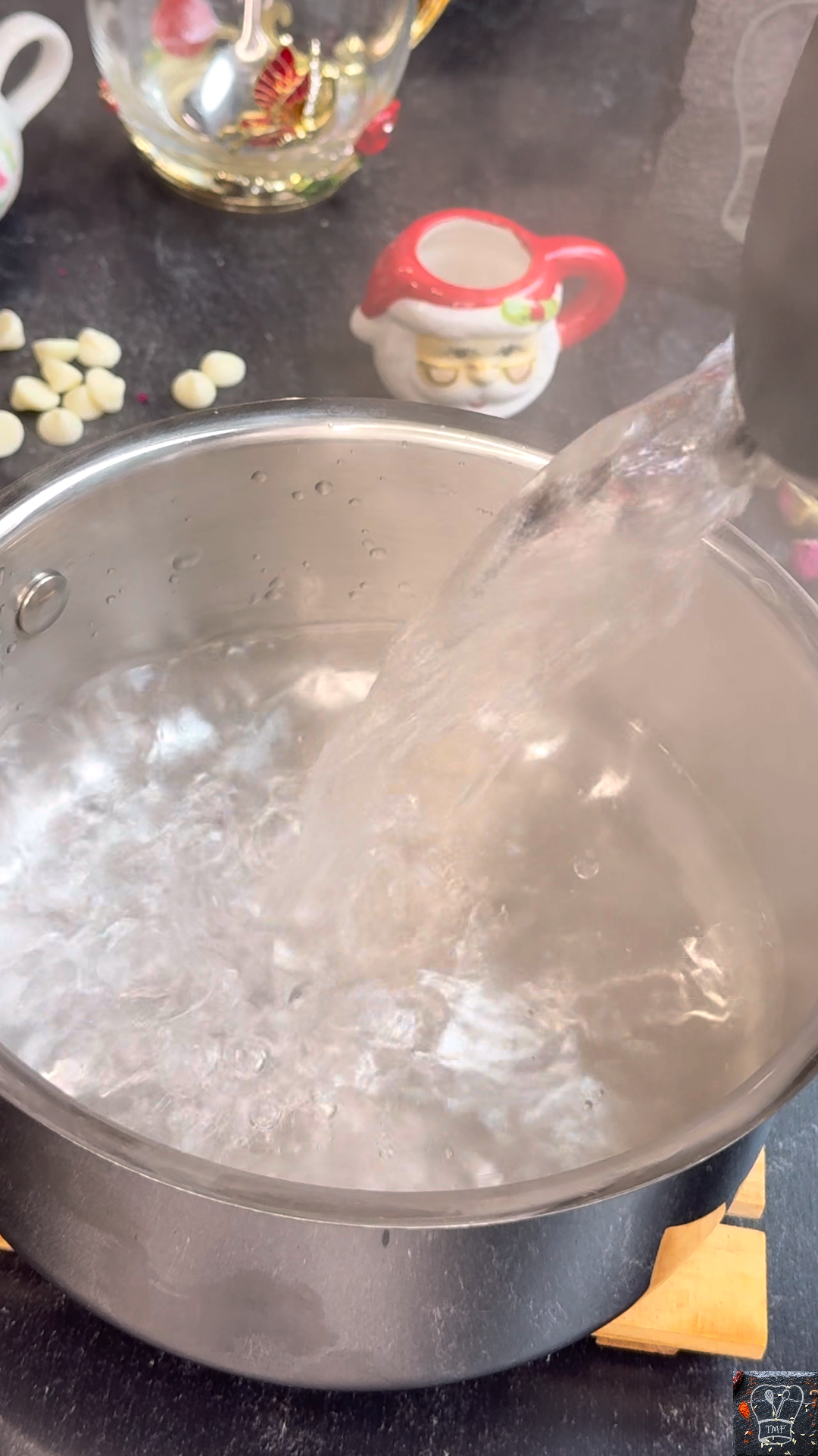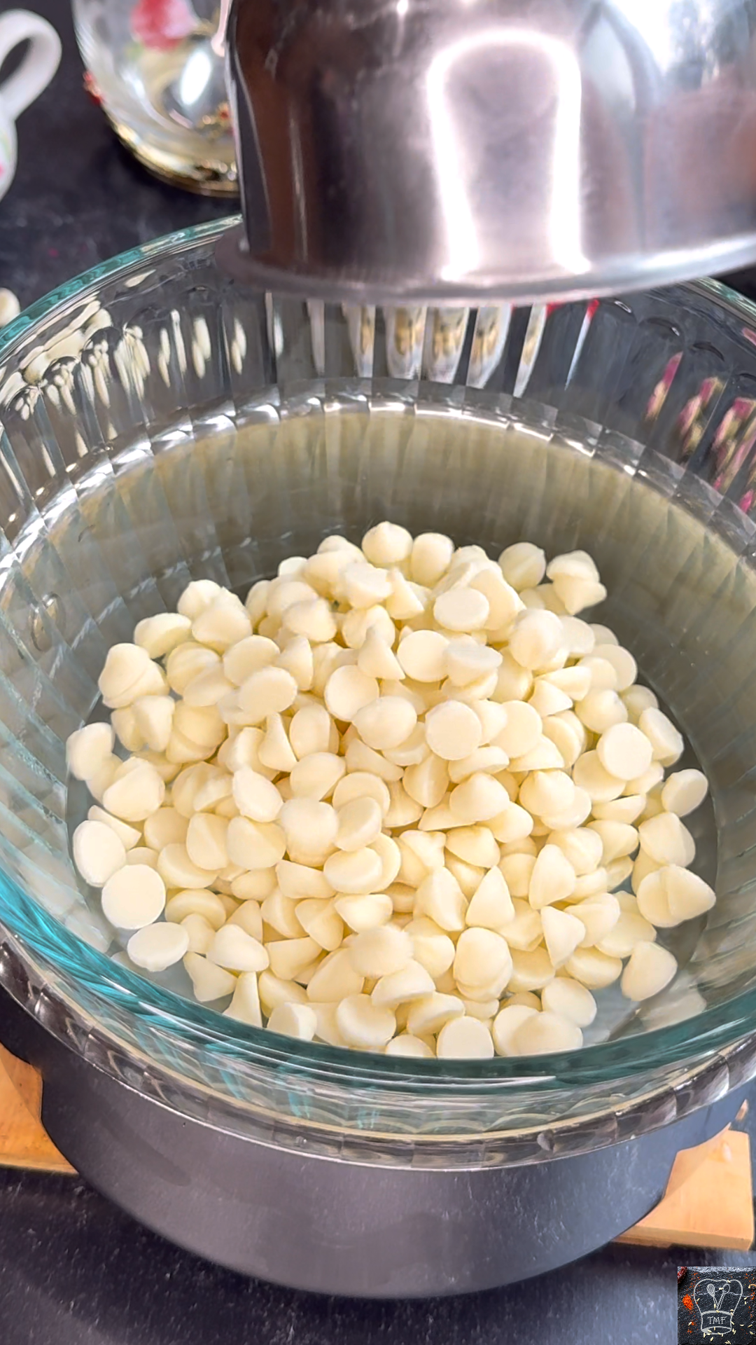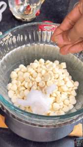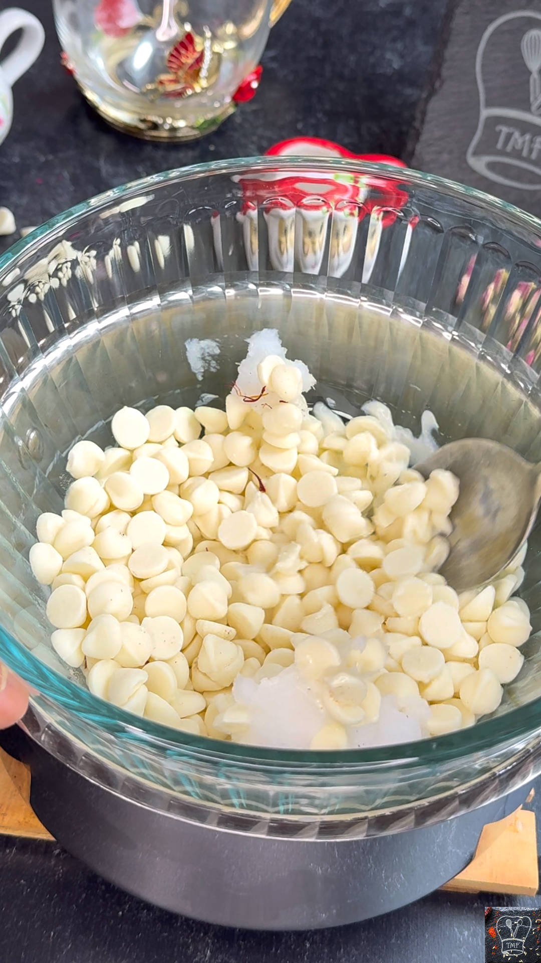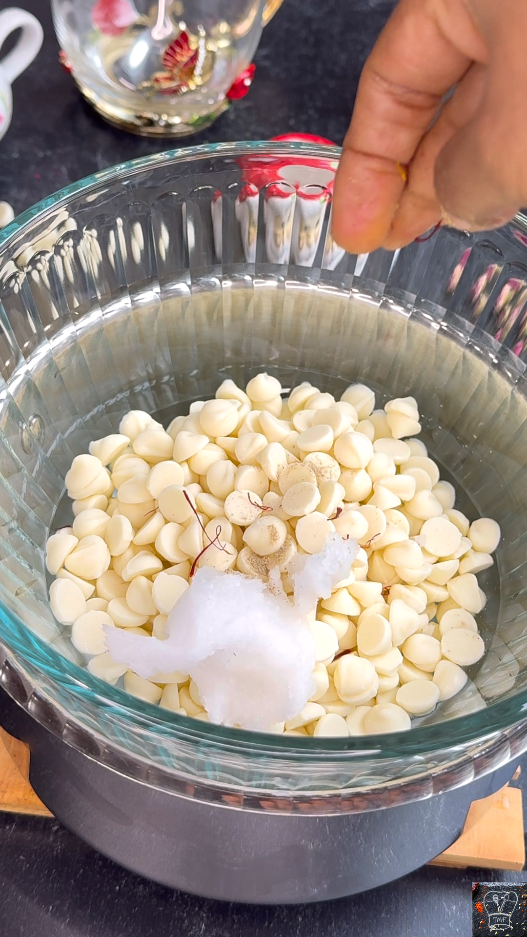- Add white chocolate chips, coconut oil, saffron, and cardamom powder