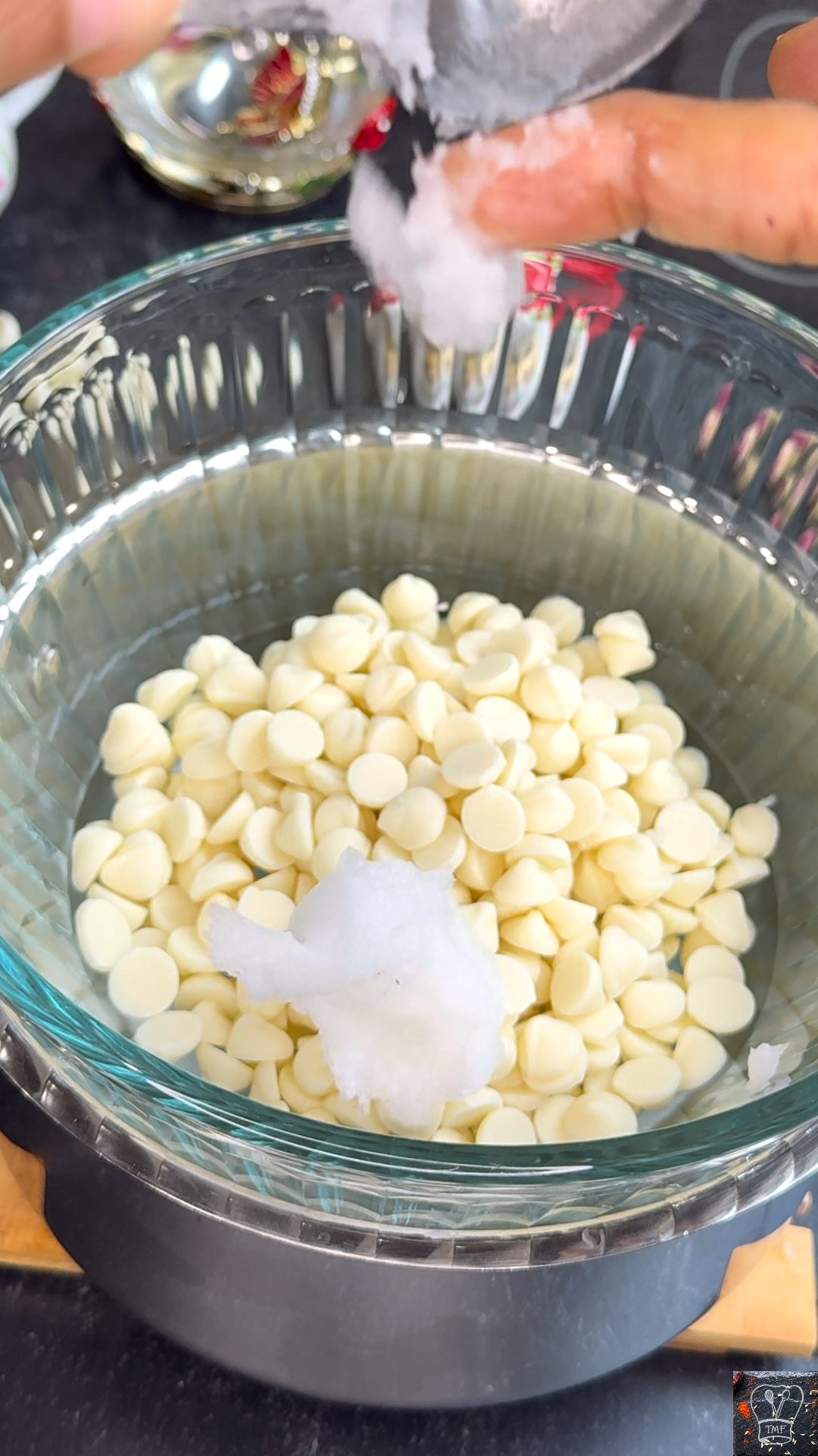 Yes — adding coconut oil helps white chocolate melt smoothly and prevents it from seizing. It also gives a glossy finish.