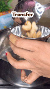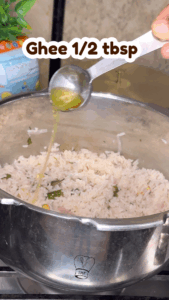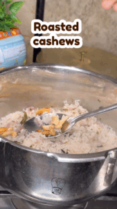 - Finally, add the fried cashews and the remaining ½ tablespoon ghee. Gently fluff the rice and serve hot.