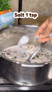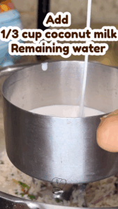 - Pour in coconut milk and water. Add salt and lemon juice, then bring to a rolling boil.