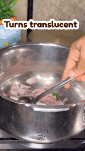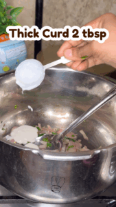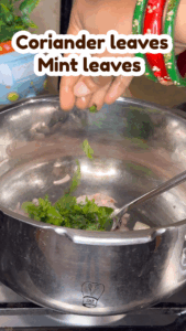 - Add mint leaves, coriander leaves, curd, and ginger garlic paste. Mix well and sauté until the raw smell disappears.