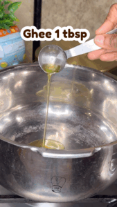 - Heat 1 tablespoon ghee and ½ tablespoon coconut oil in a pressure cooker.