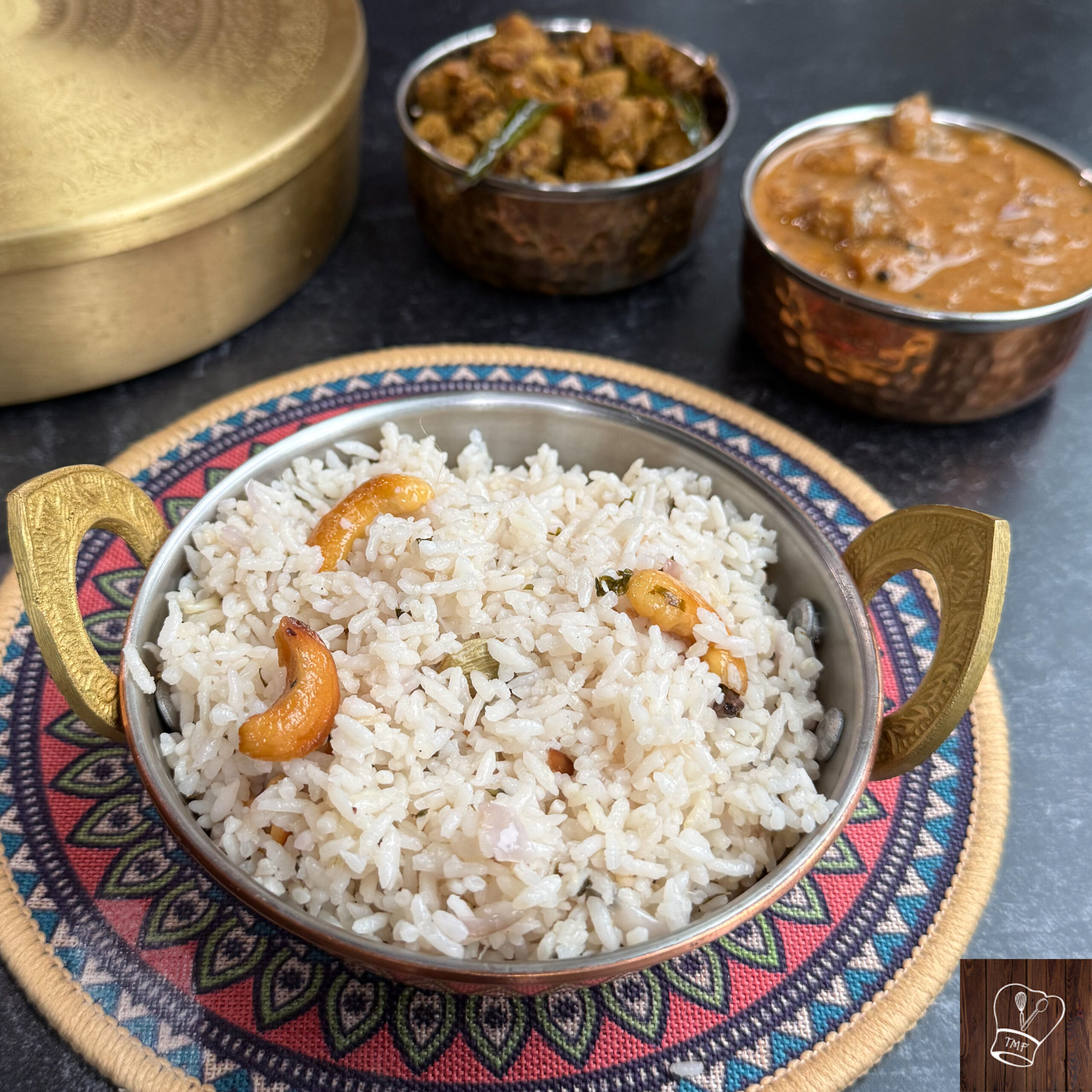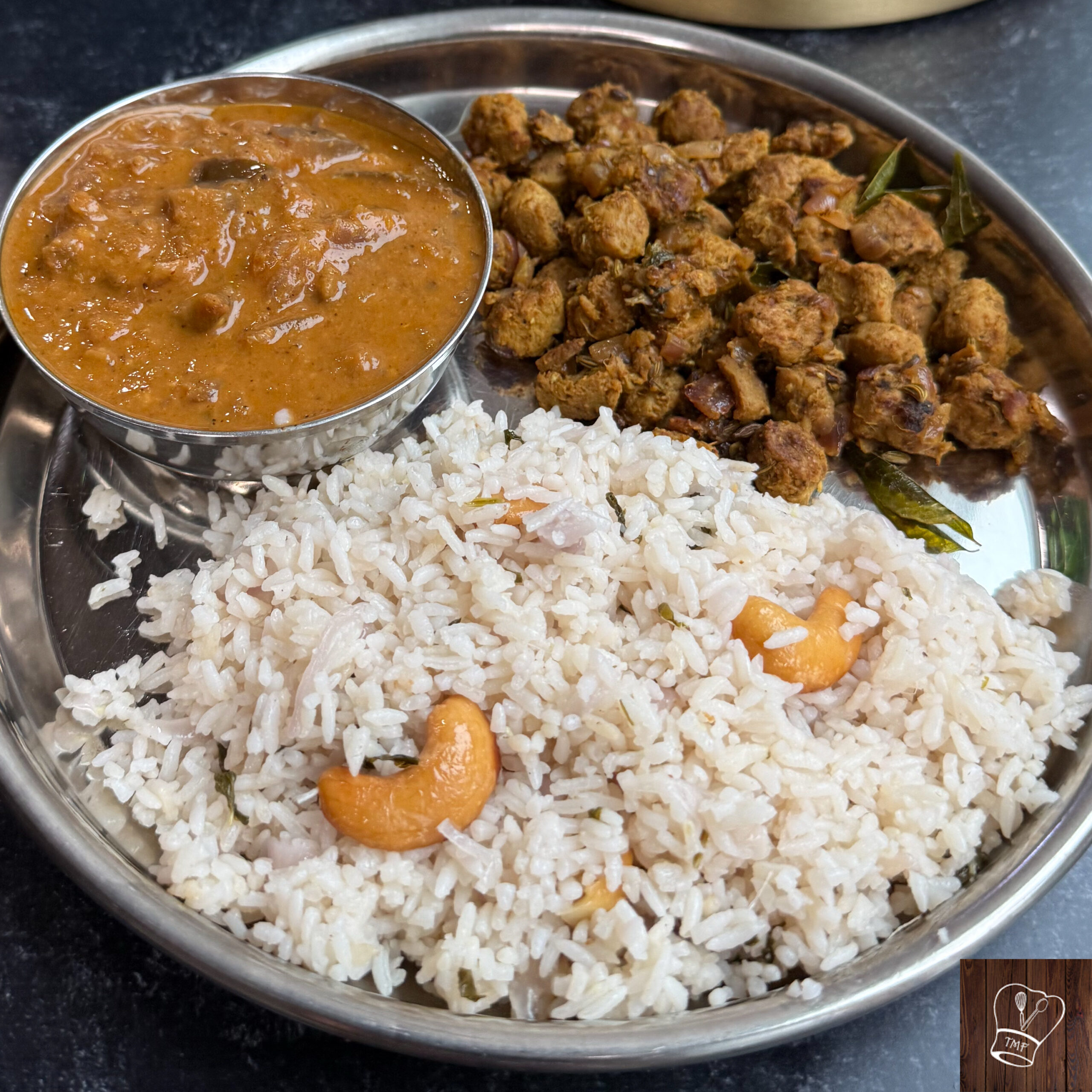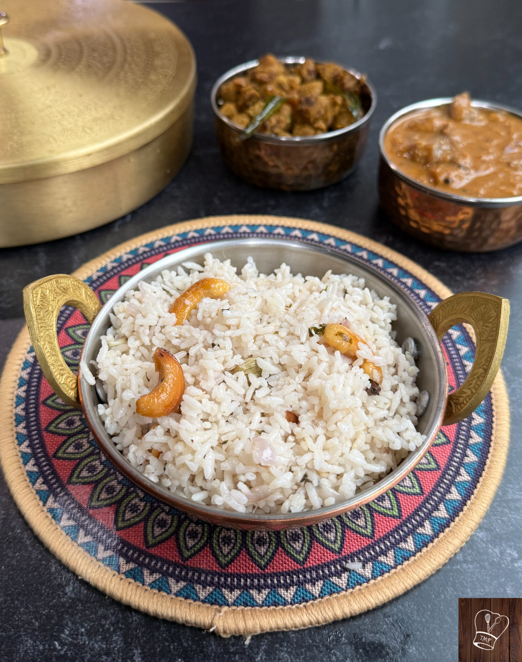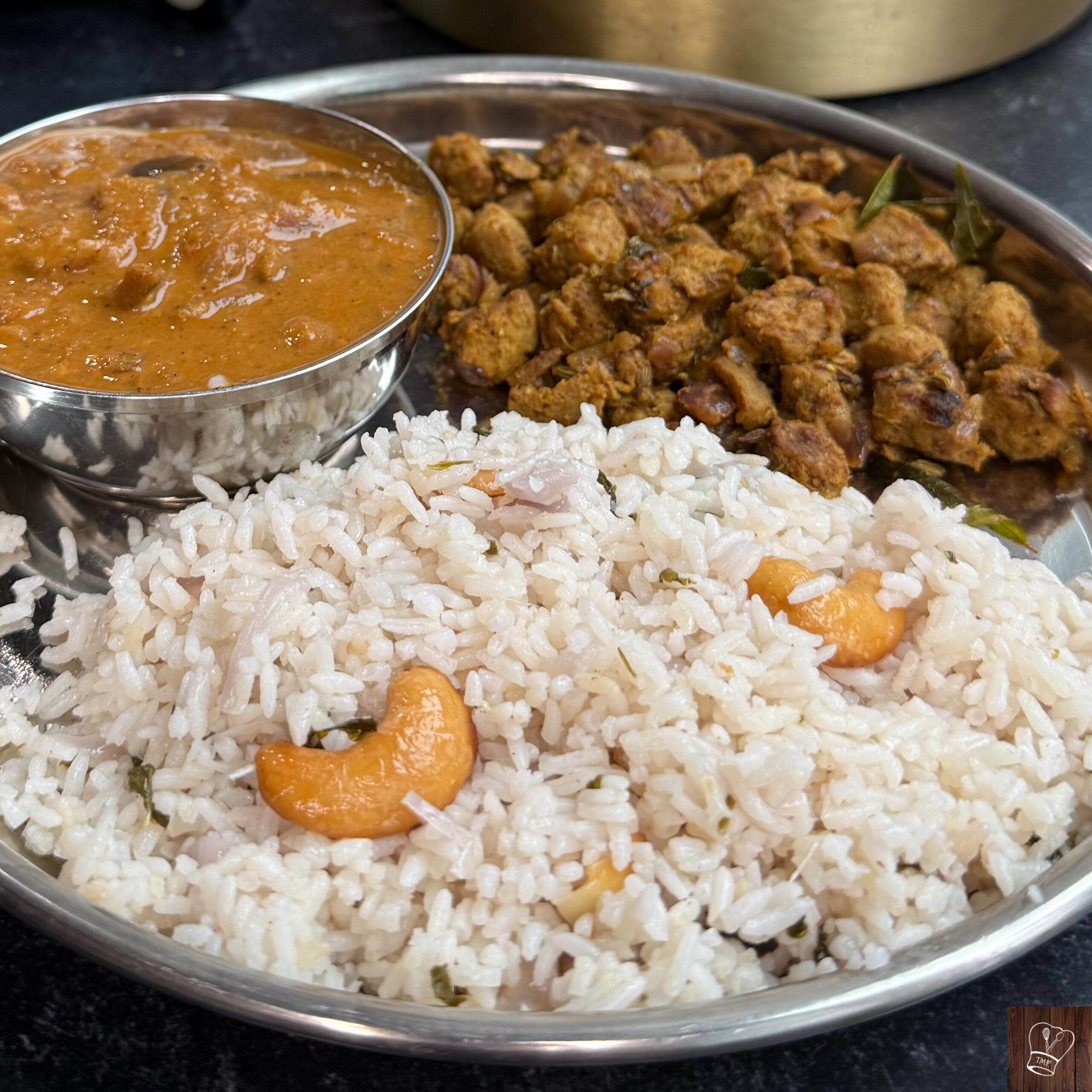 Thengai Paal Sadam (coconut milk rice) is cooked with fresh coconut milk, giving it a creamy texture and subtle sweetness that pairs well with spicy curries.