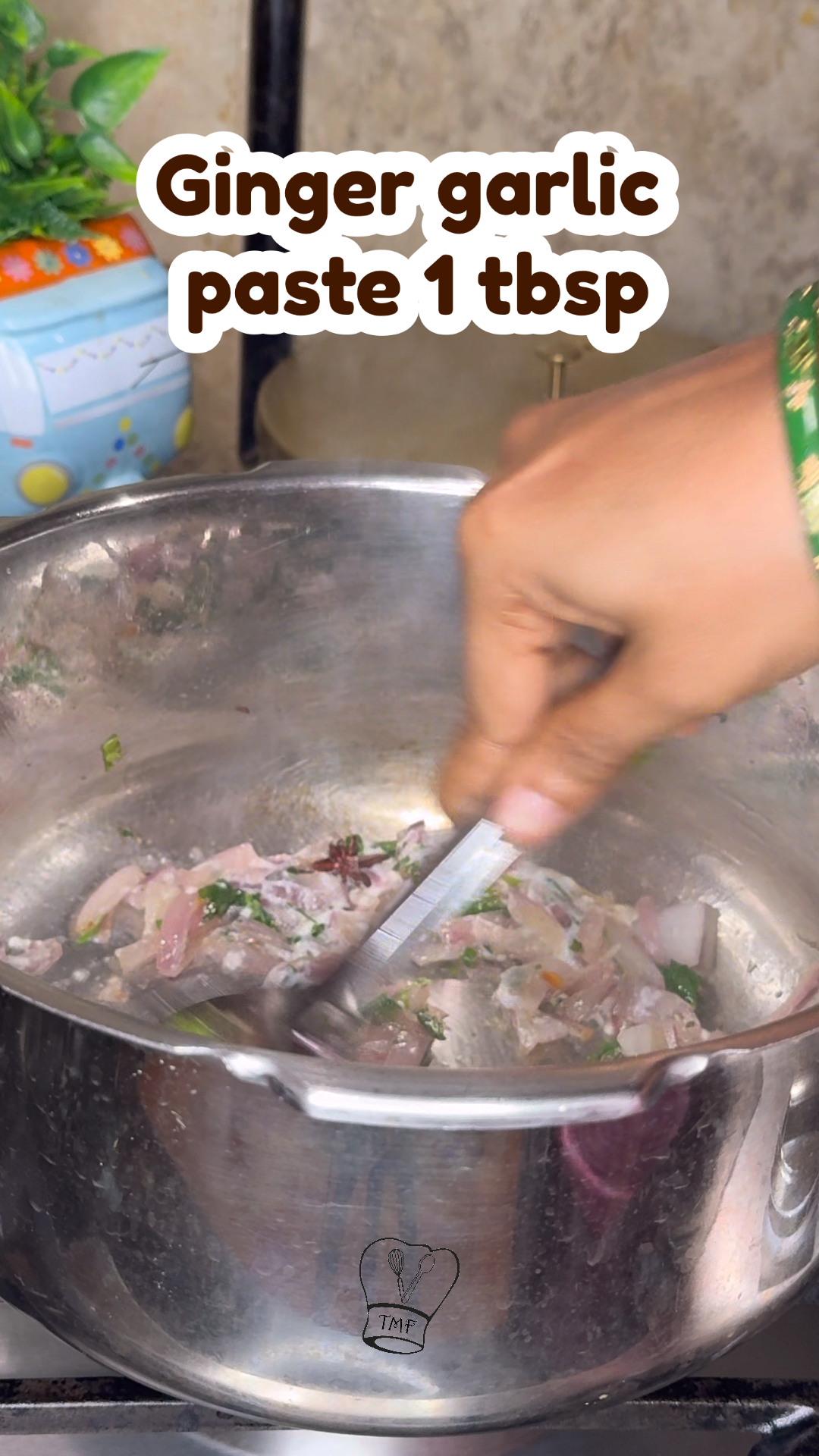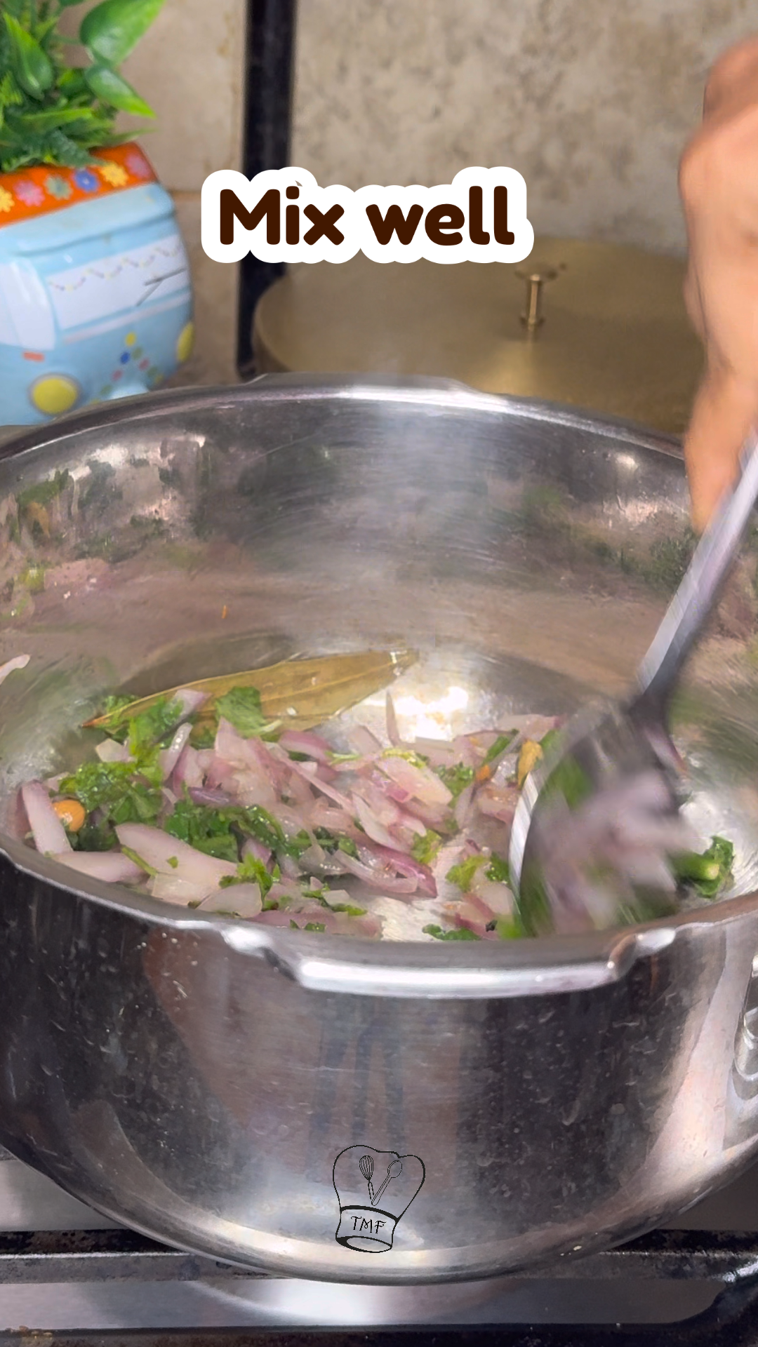 - Add mint leaves, coriander leaves, curd, and ginger garlic paste. Mix well and sauté until the raw smell disappears.