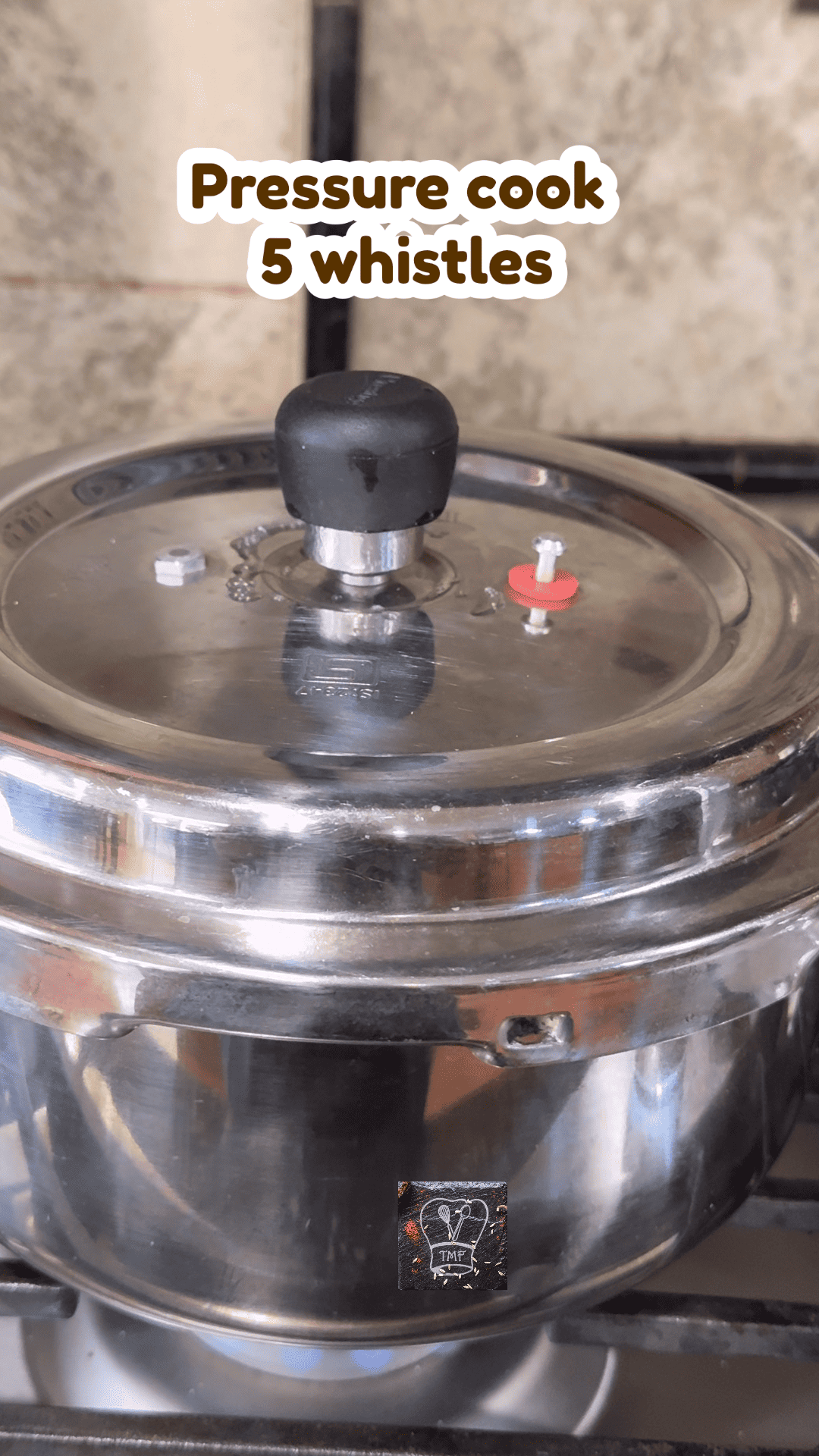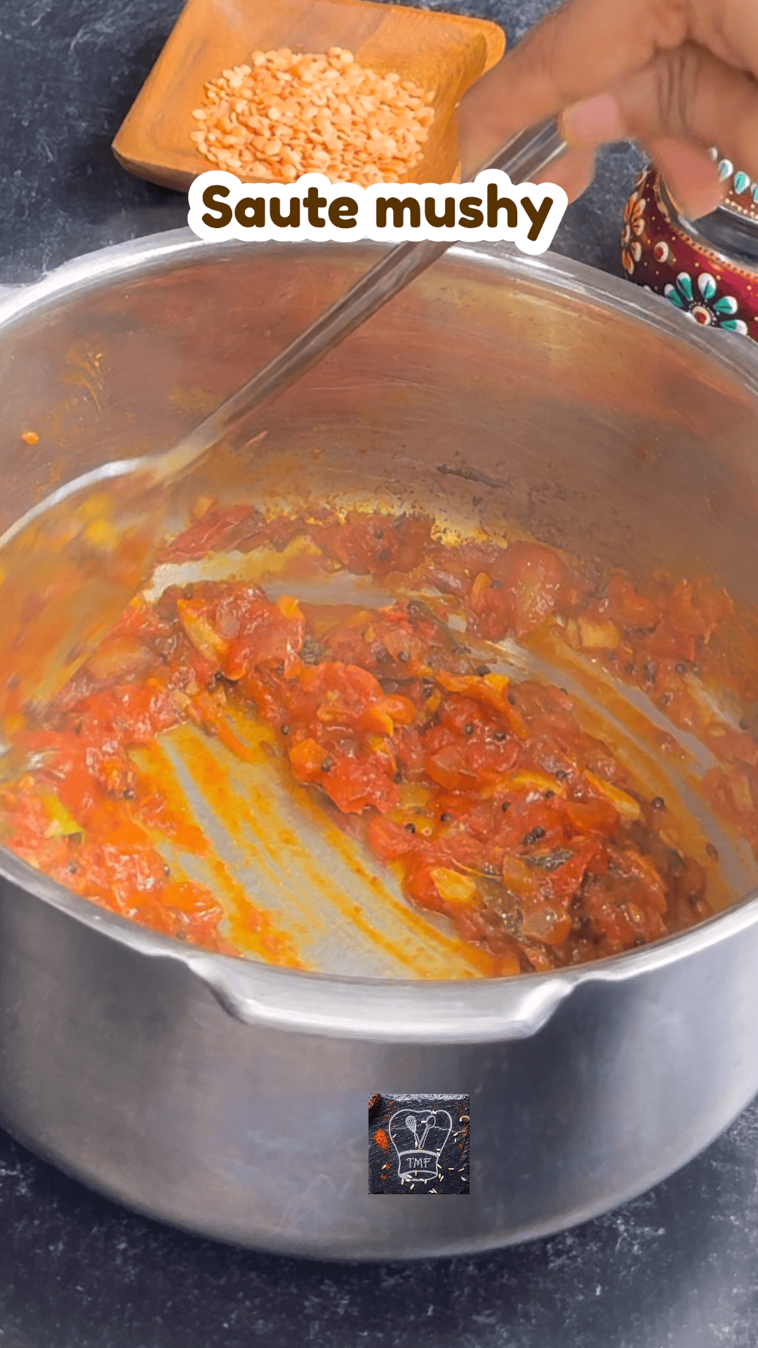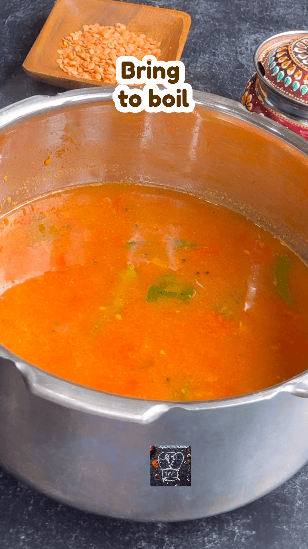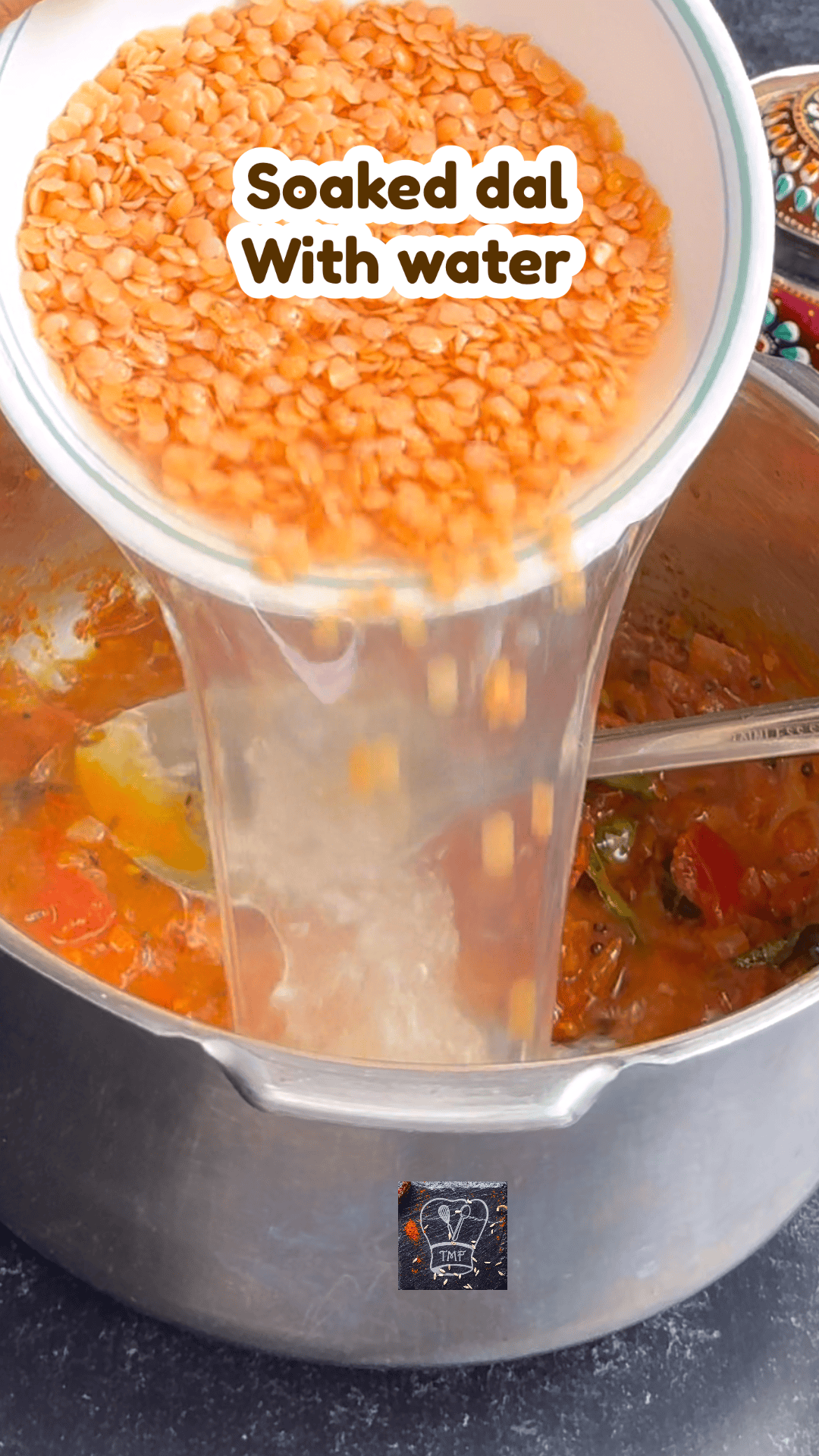 Preparing red lentil curry in a stainless steel pot for a traditional Indian dish.