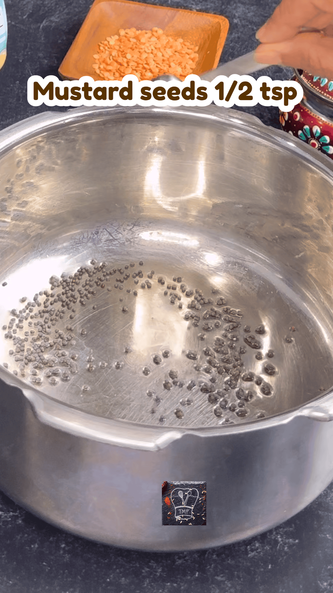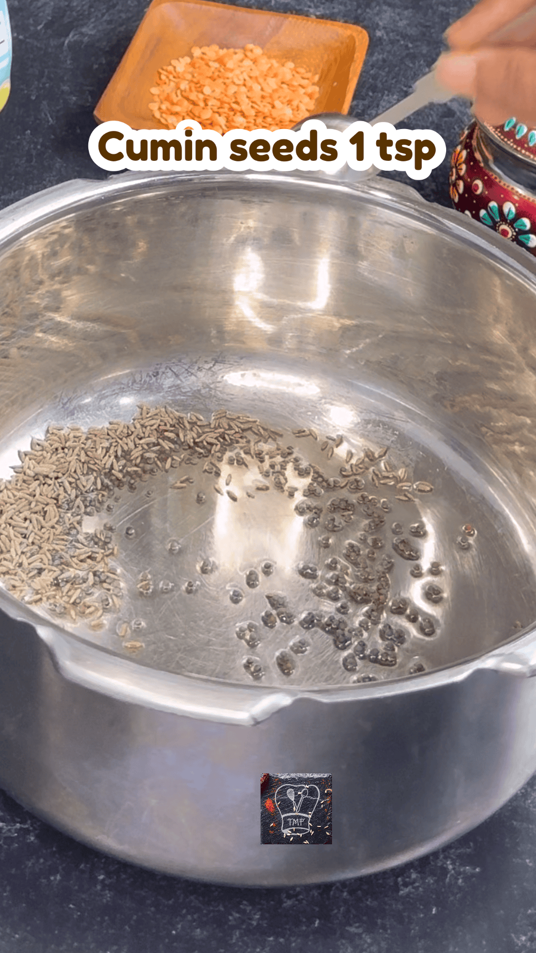 Cumin seeds being added to a stainless steel pot for red lentil curry.
