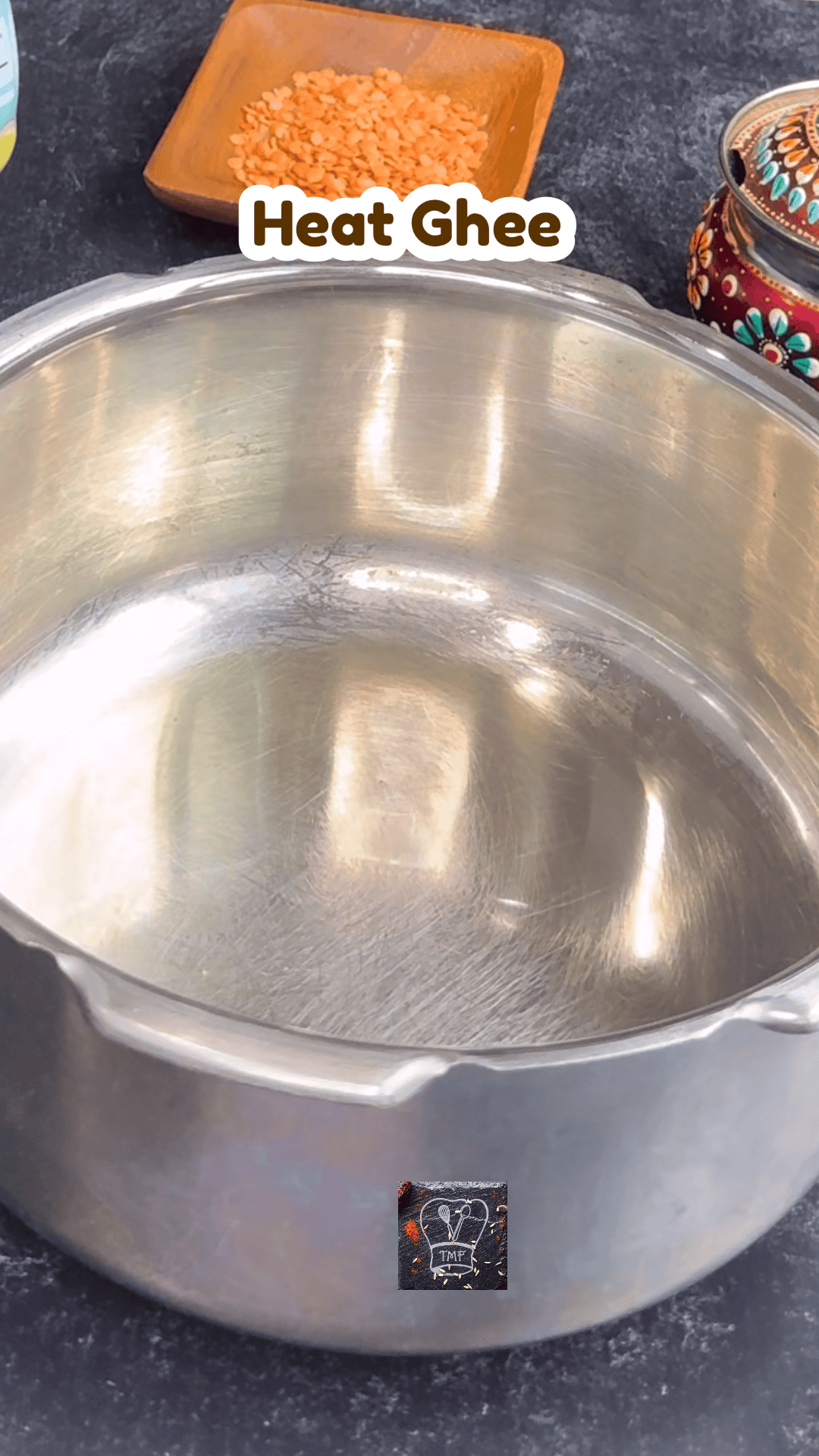 Heating ghee in a stainless steel pot for making red lentil curry.