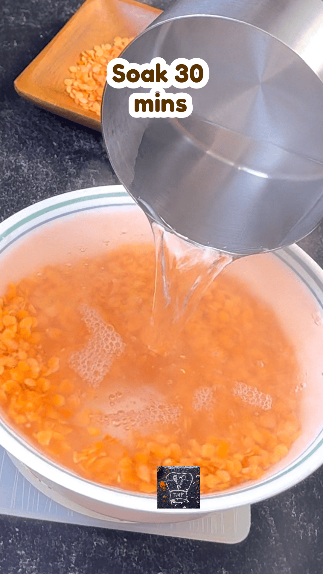 Soaking red lentils for curry in a bowl with water, ready to cook.