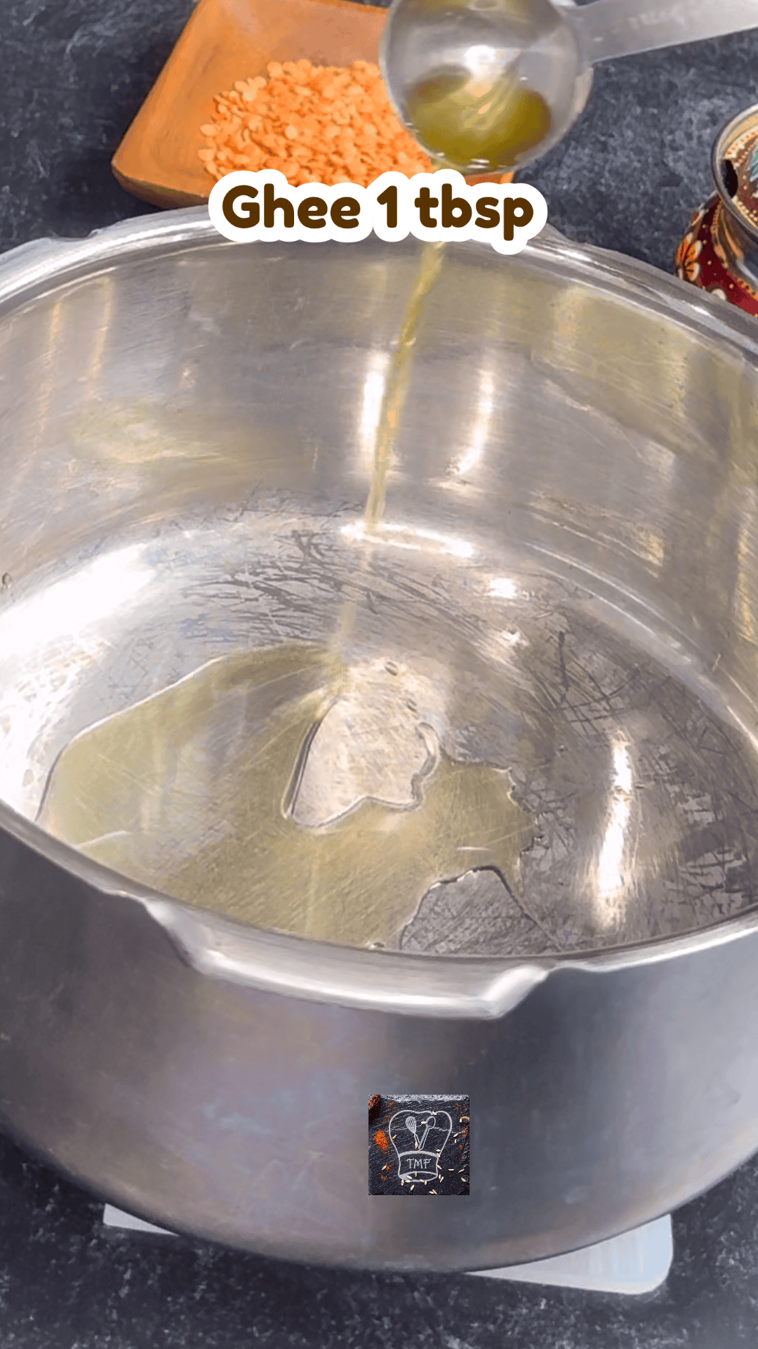 Ghee being poured into a stainless steel pot for lentil curry preparation.