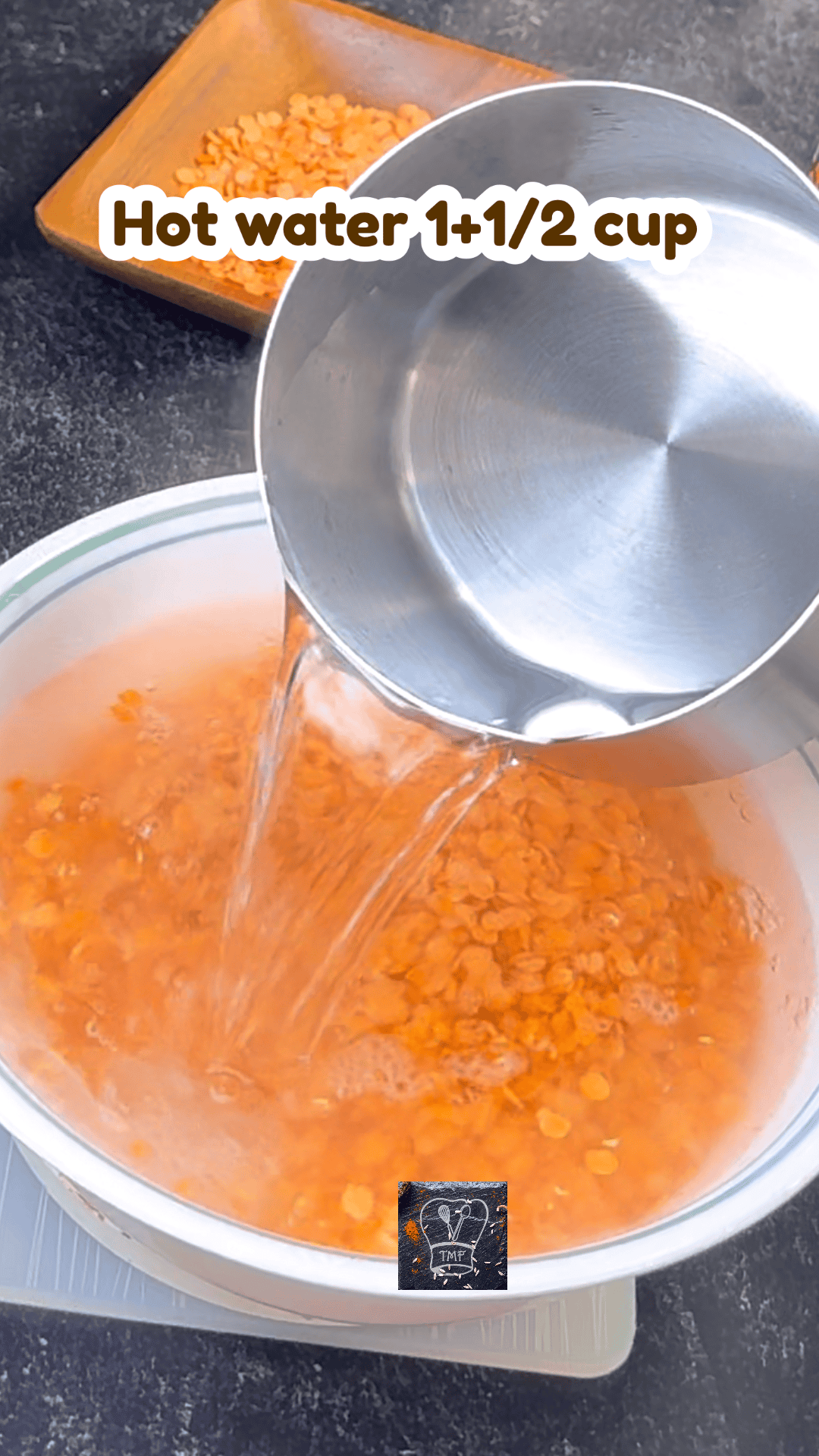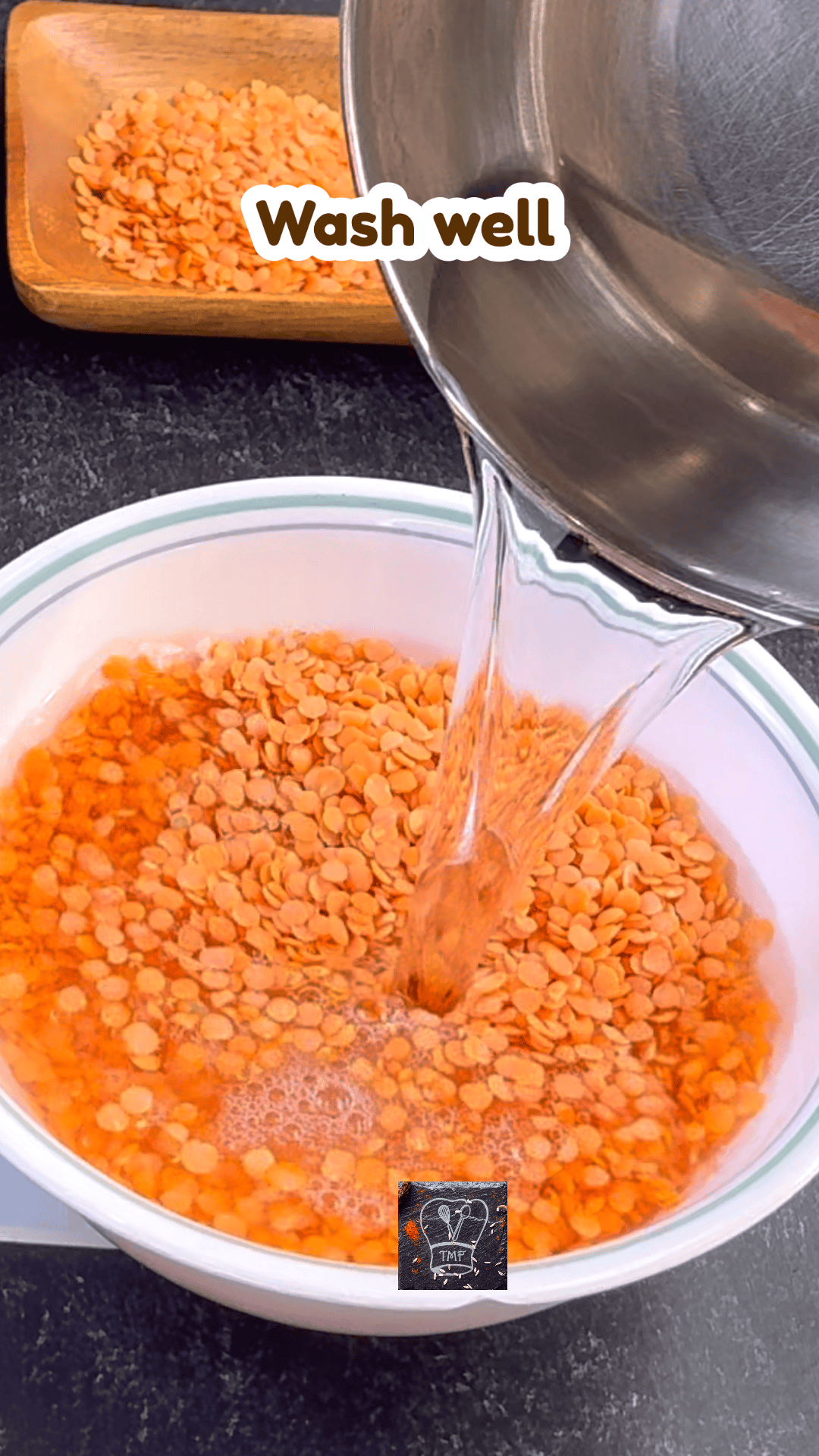 Pouring water over red lentils in a bowl for Masoor Dal, a traditional Indian lentil curry.