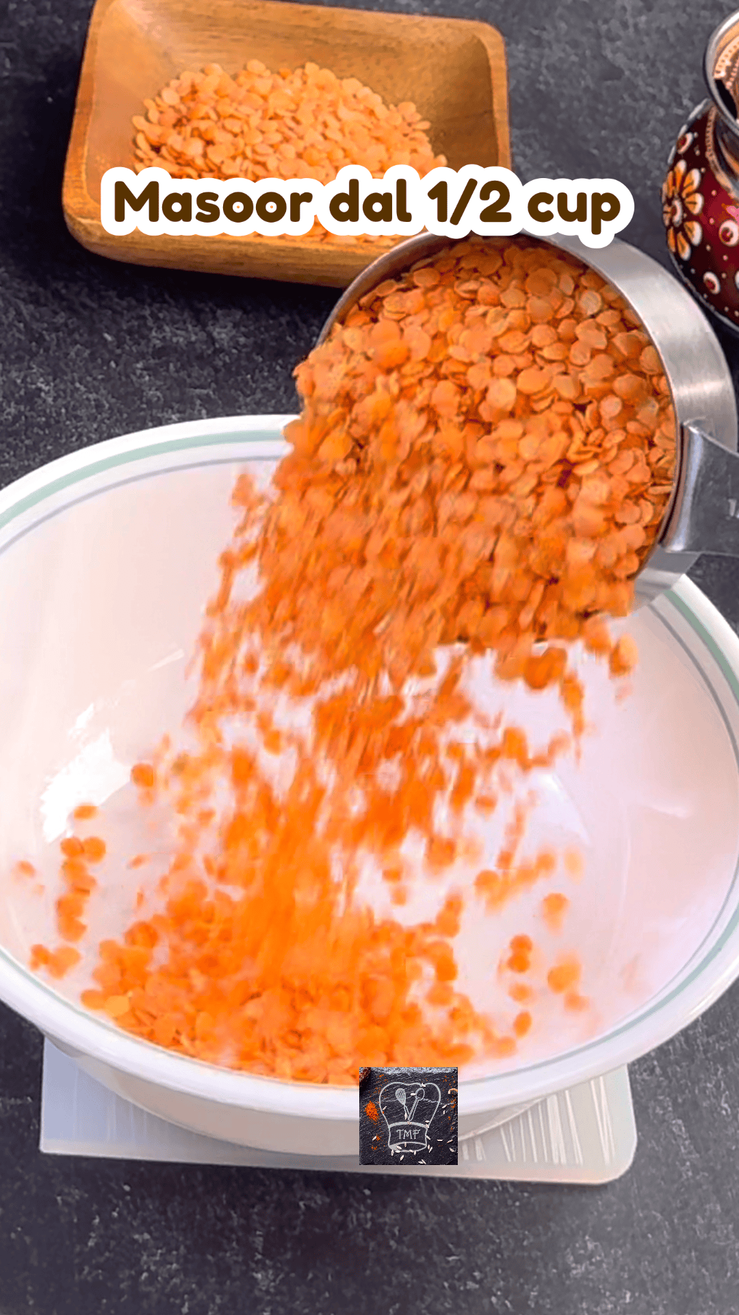 Red lentils being measured for Masoor dal, a flavorful Indian curry dish.