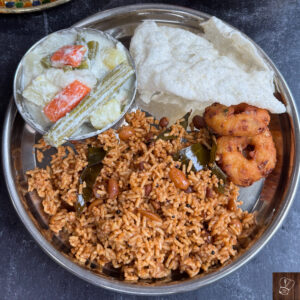 Puliyodarai (Puli Sadam) is a traditional South Indian rice dish made with tamarind, spices, and roasted lentils. It’s known for its tangy, spicy, and slightly sweet flavor.