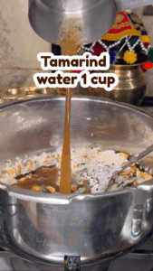 - ️ Add tamarind extract, water, salt, jaggery, and Kashmiri chilli powder