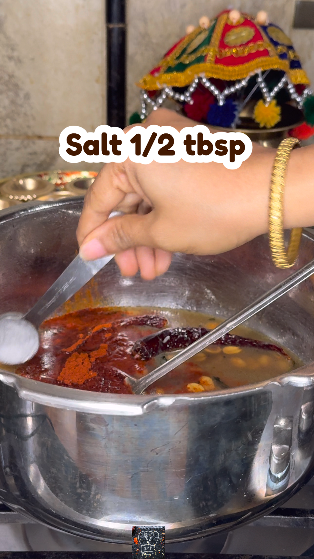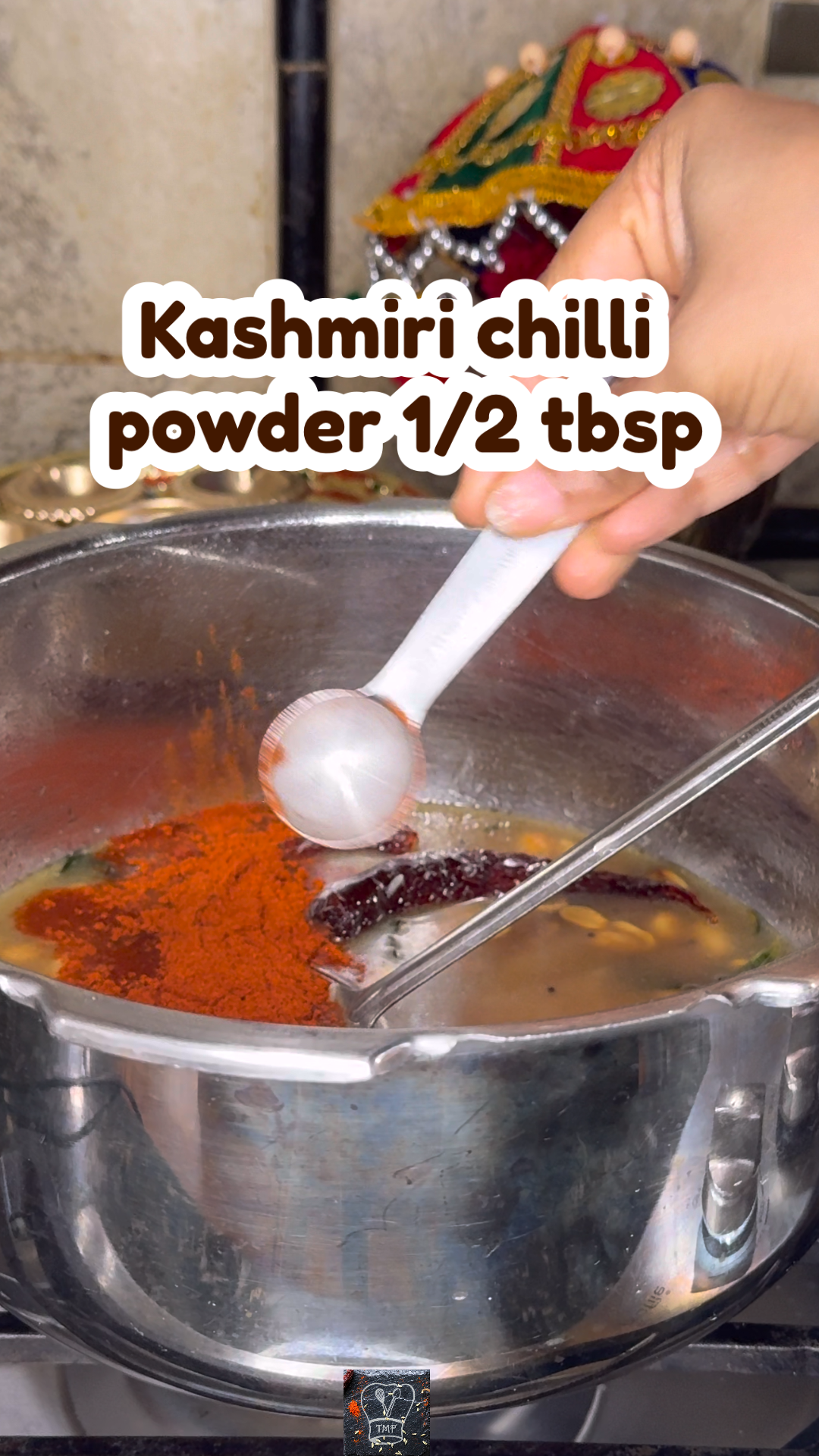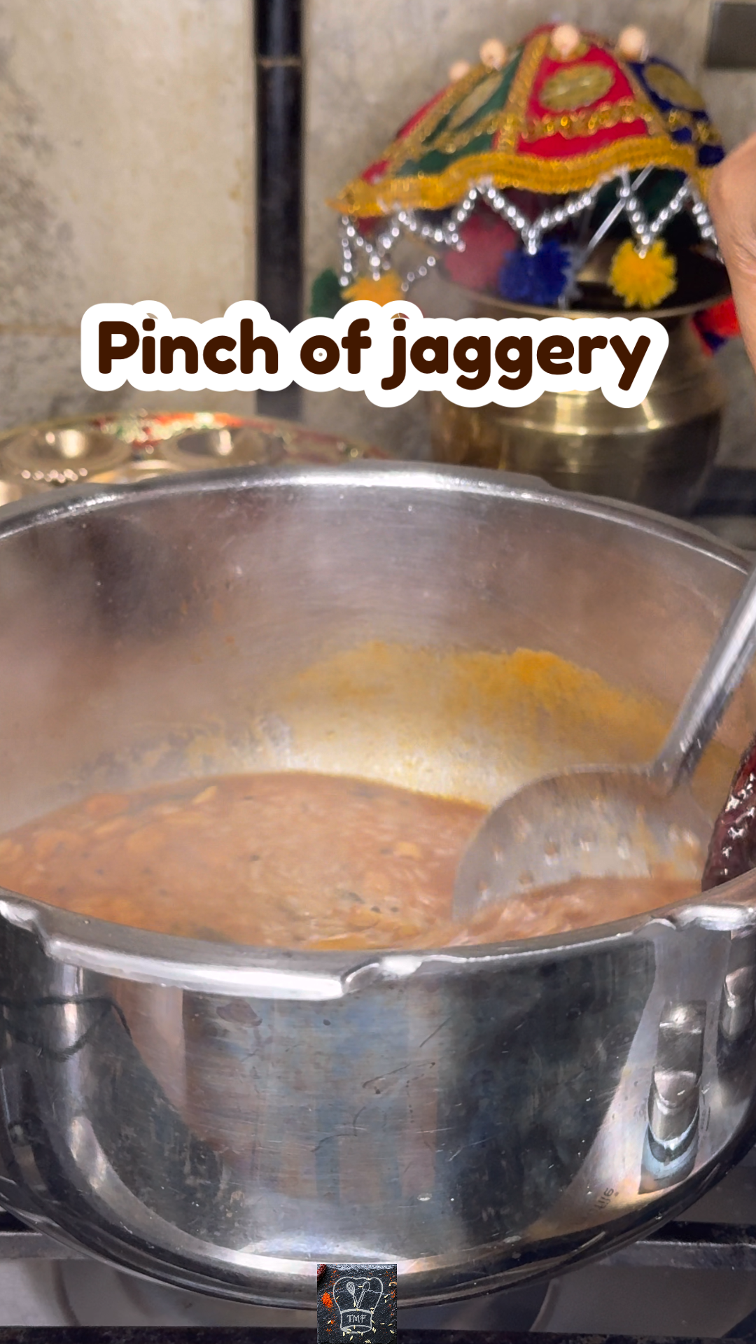 - ️ Add tamarind extract, water, salt, jaggery, and Kashmiri chilli powder