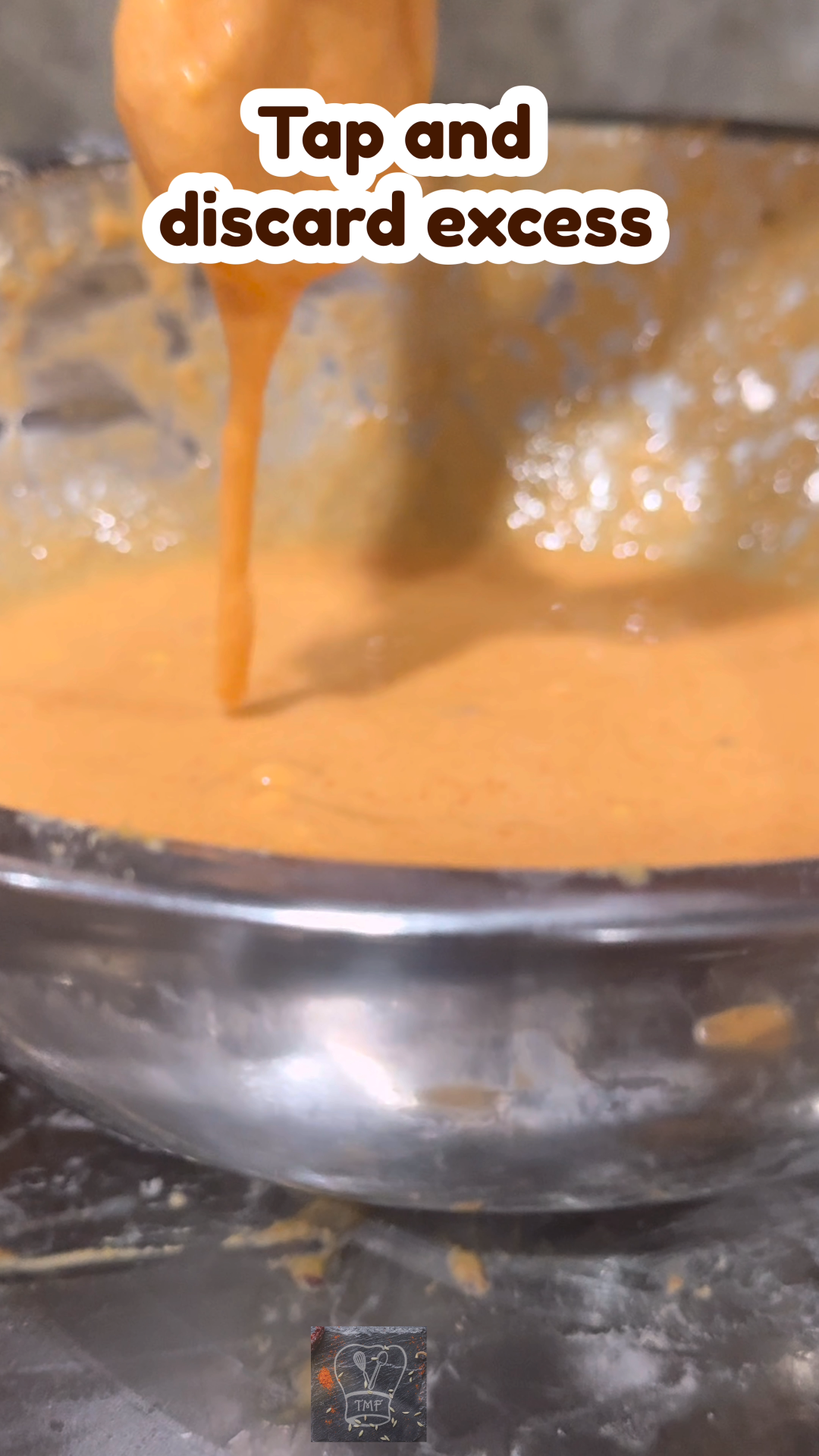 - Drip off excess batter before gently sliding the slice into hot oil.