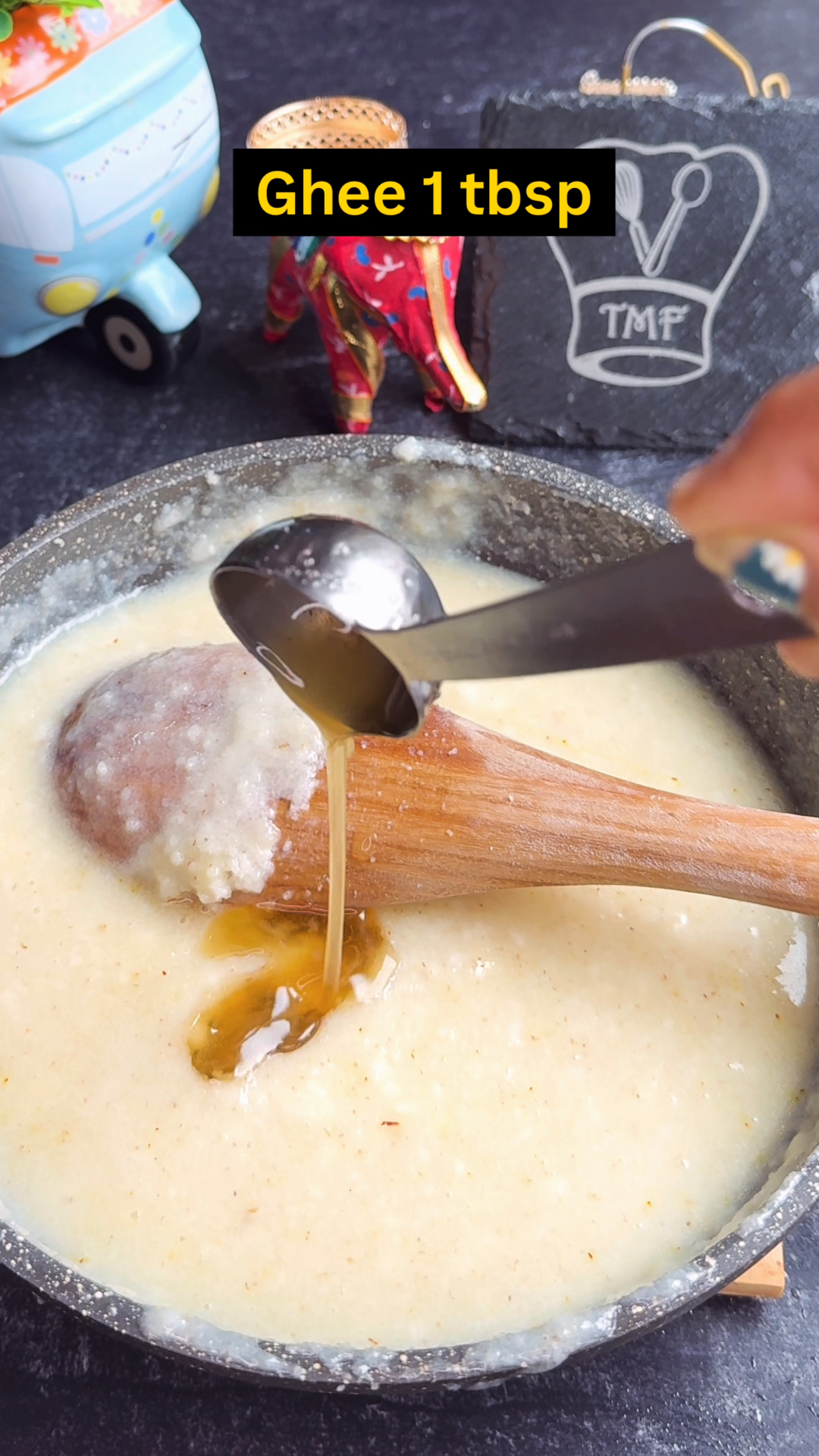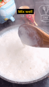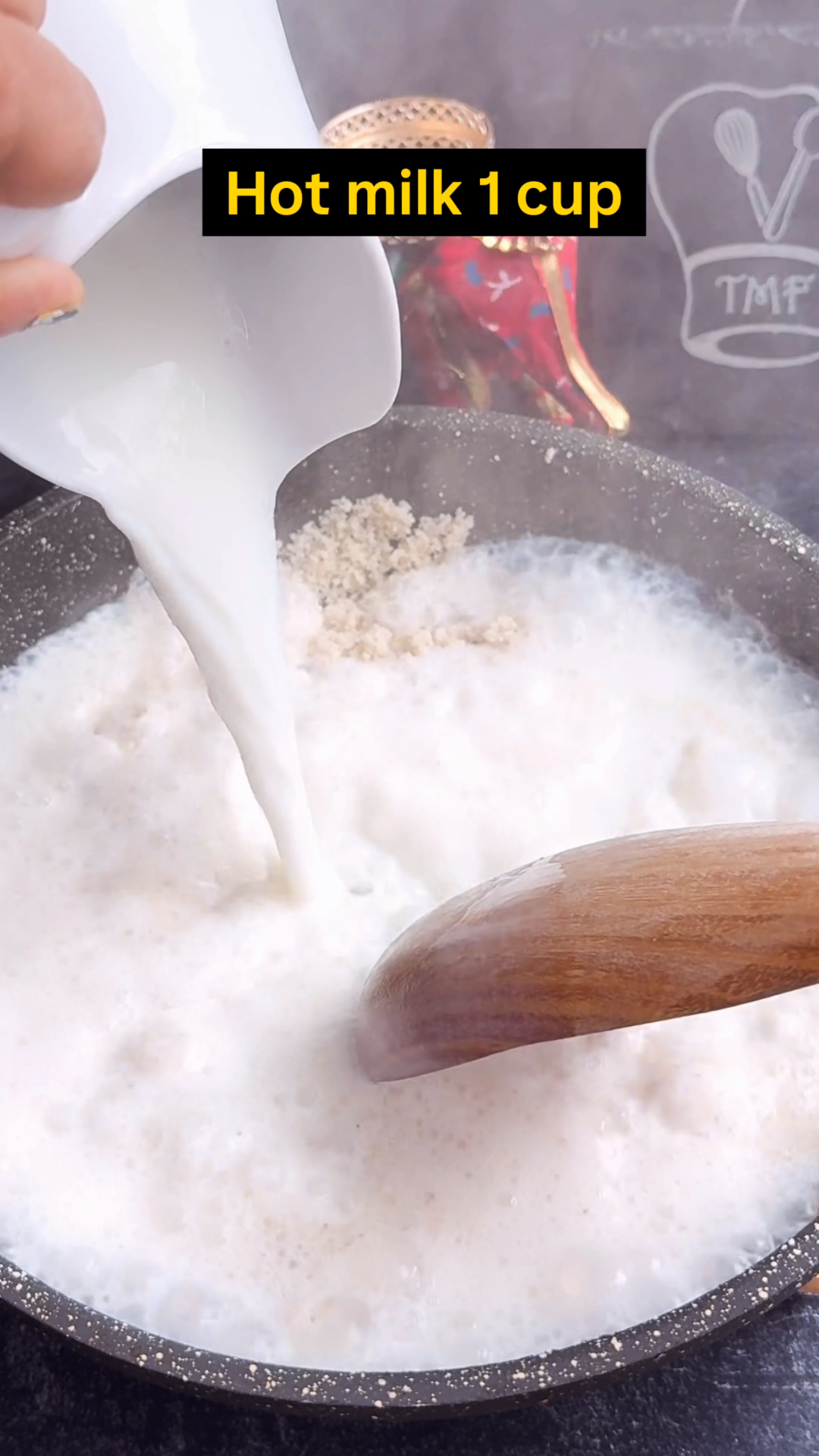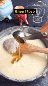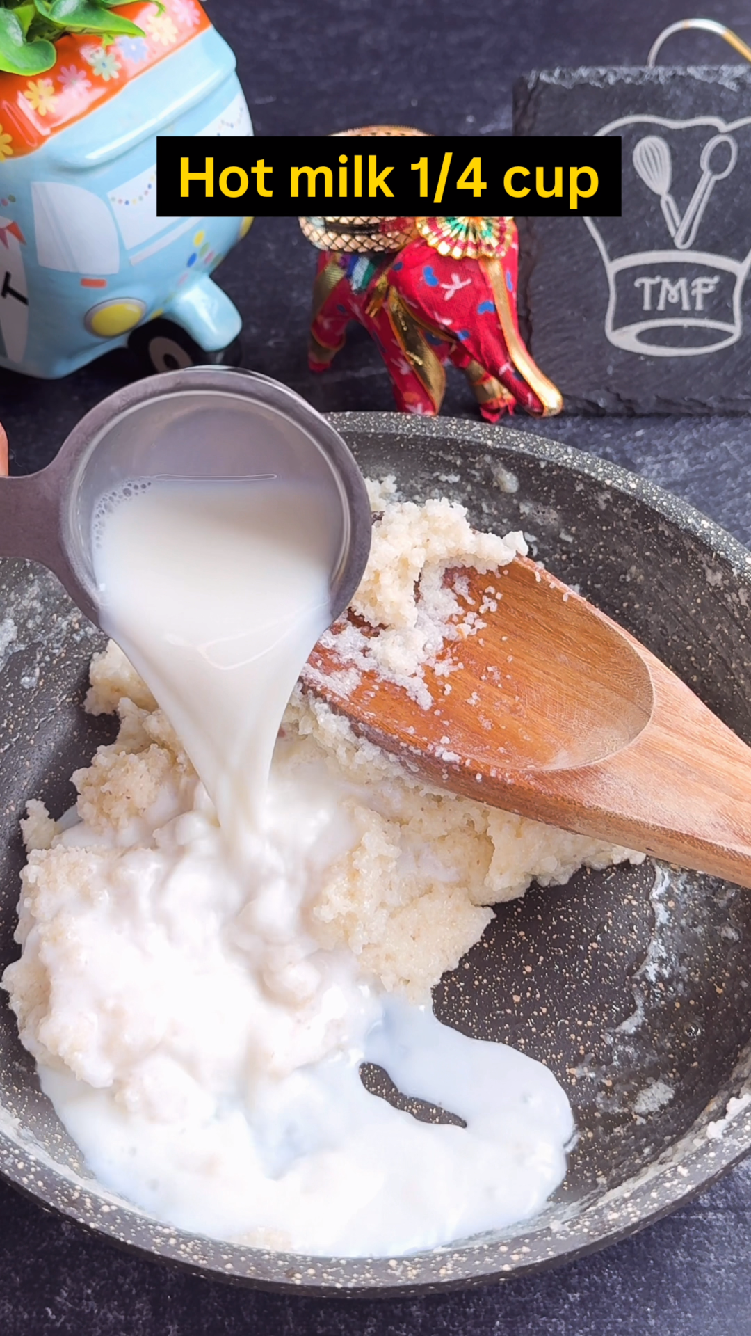 - Add 1 tablespoon ghee, oil, and 1/4 cup hot milk. Mix well