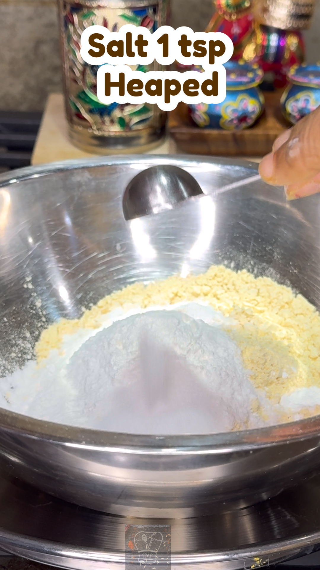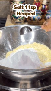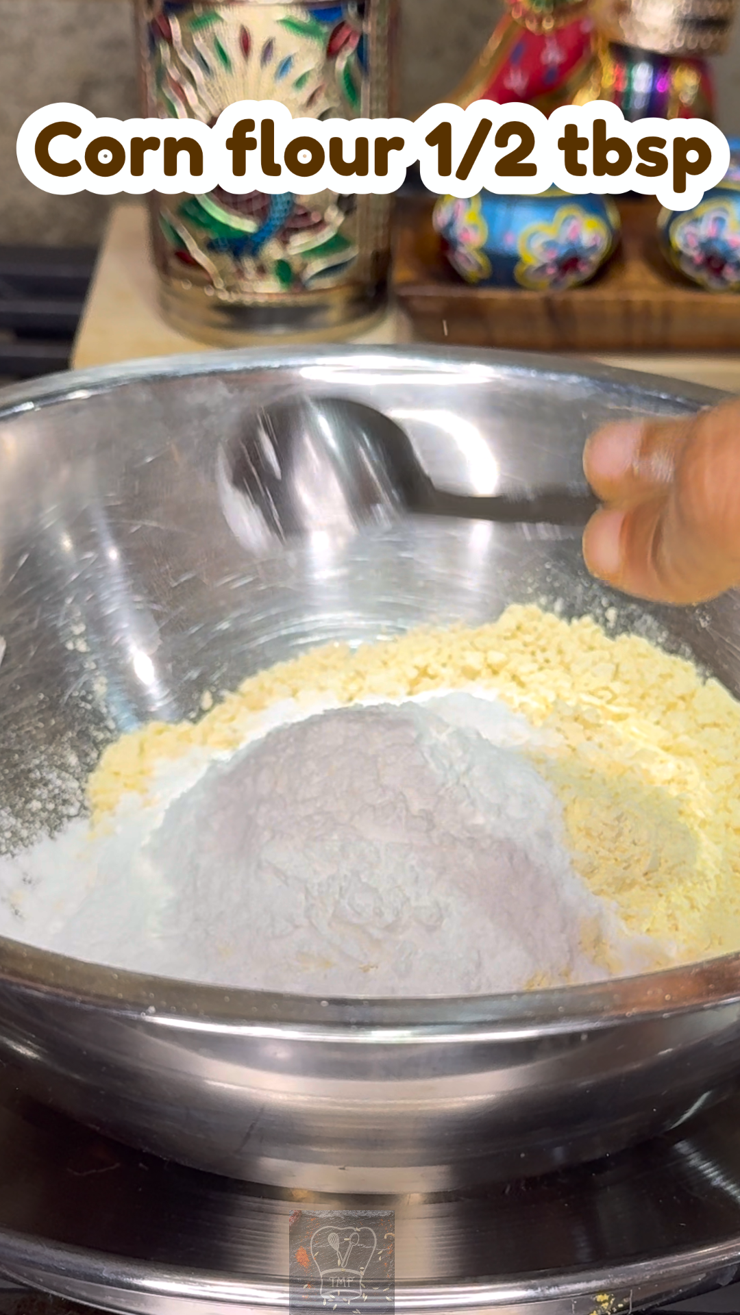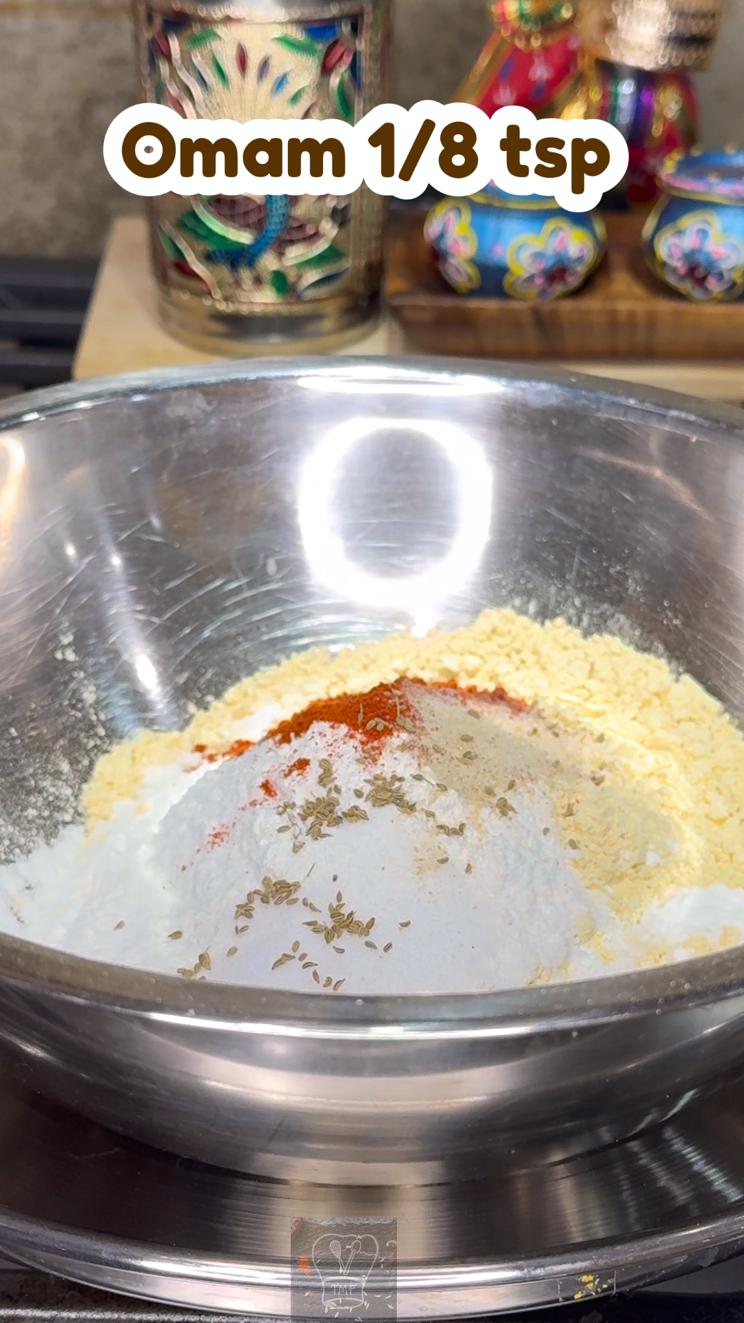 •  In a mixing bowl, combine besan flour, rice flour, corn flour, salt, asafoetida, turmeric powder, Kashmiri chilli powder, and carom seeds.