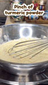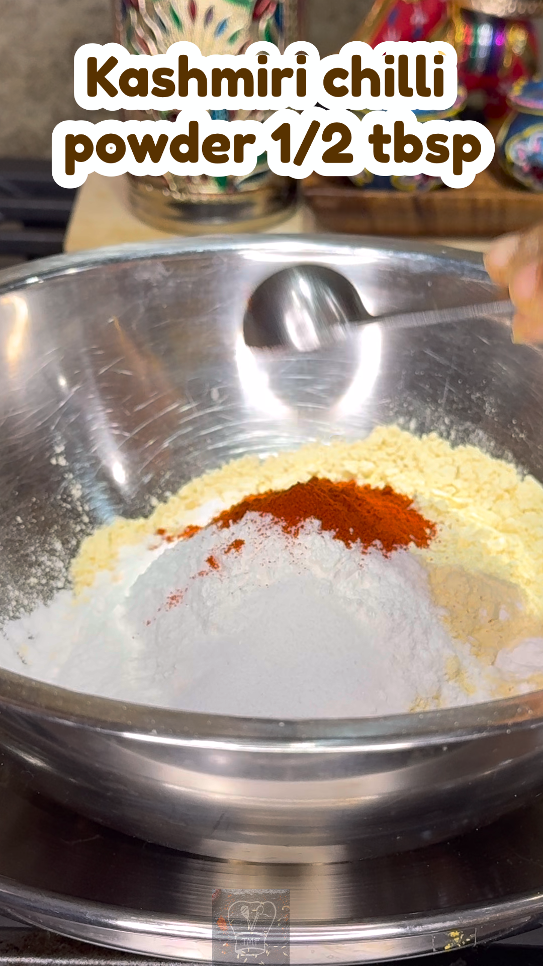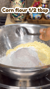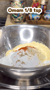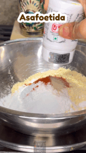 • In a mixing bowl, combine besan flour, rice flour, corn flour, salt, asafoetida, turmeric powder, Kashmiri chilli powder, and carom seeds.