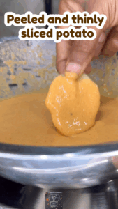 Slice the potatoes into thin, even rounds. Thinner slices give crispier bajjis, while thicker slices stay soft inside.