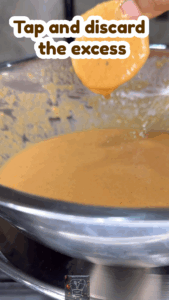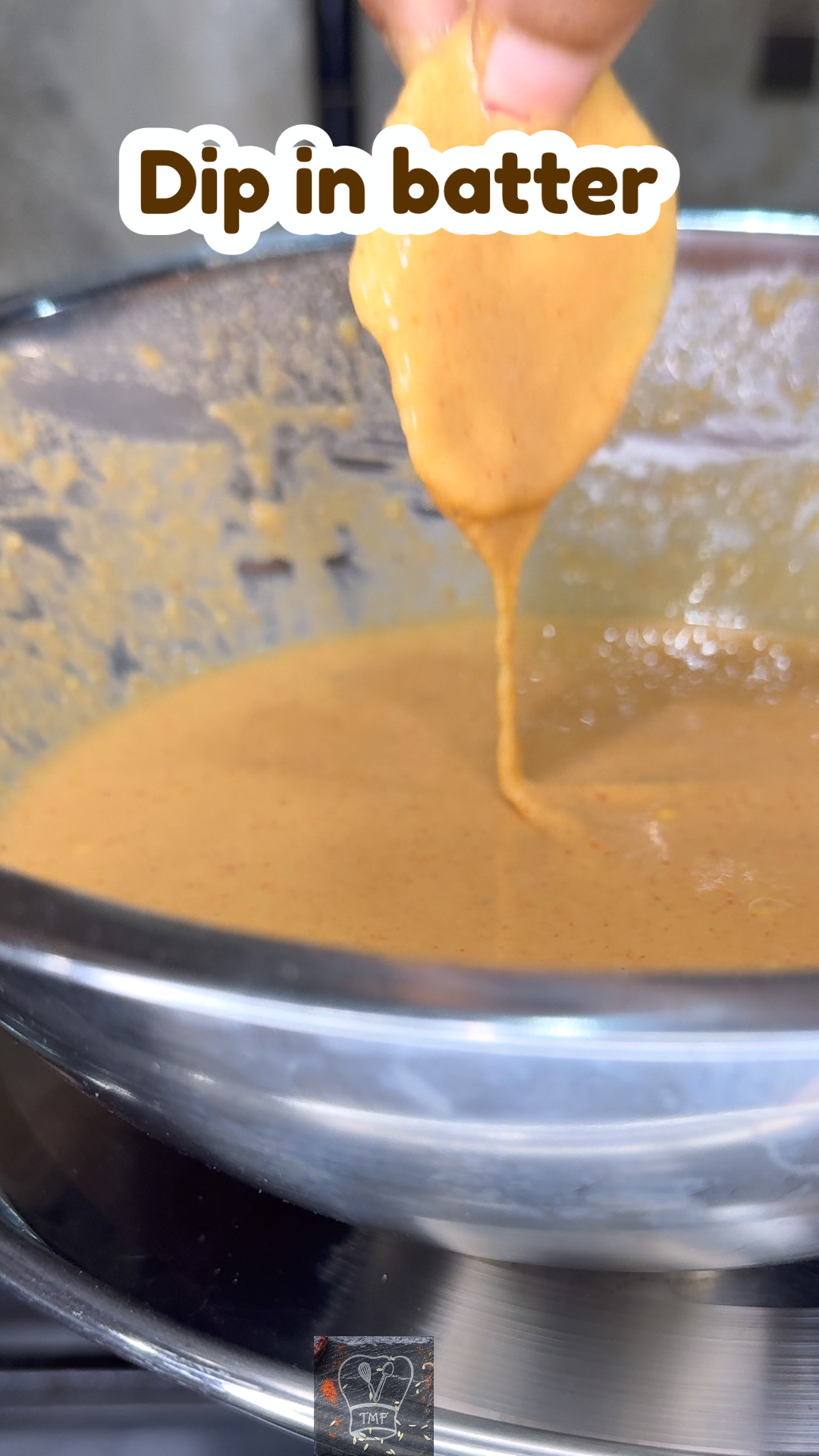 • Drip off excess batter before gently sliding the slice into hot oil.