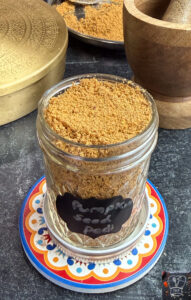 It’s a South Indian–style chutney powder made using roasted pumpkin seeds, dals, spices, and garlic. It’s similar to idli milagai podi but with a nutritious twist.