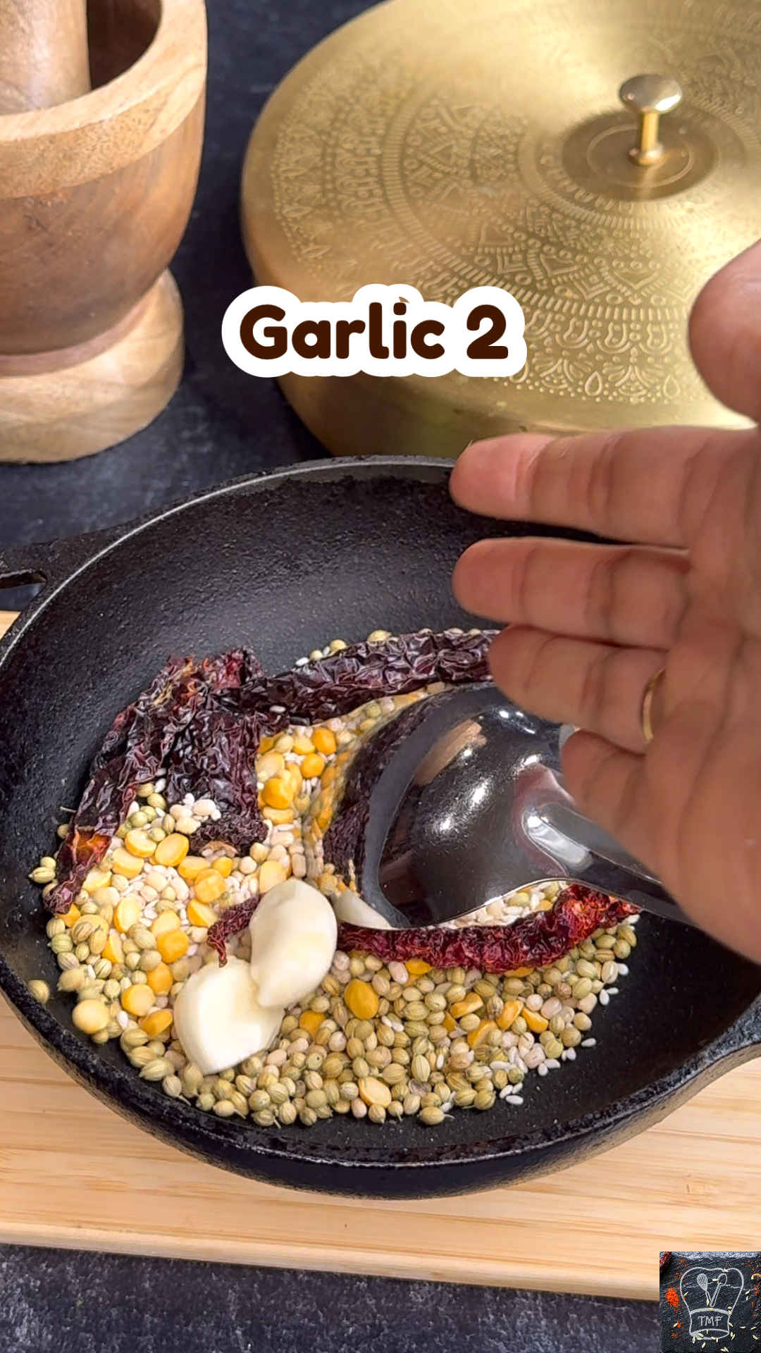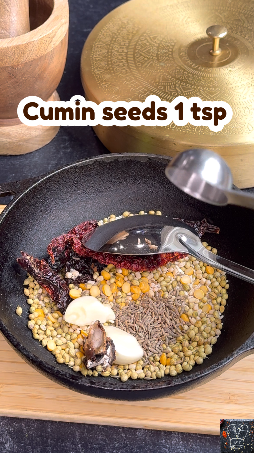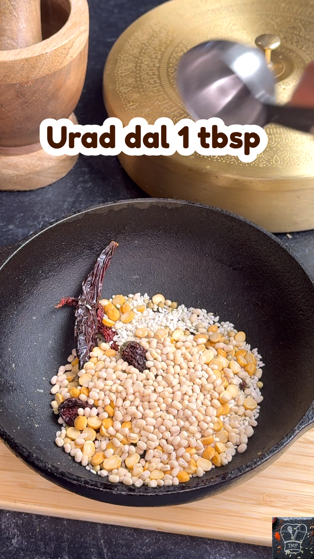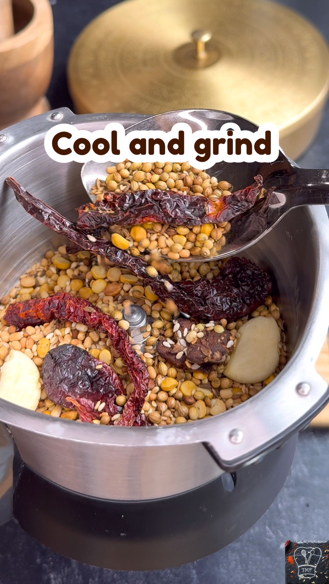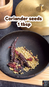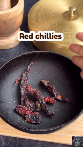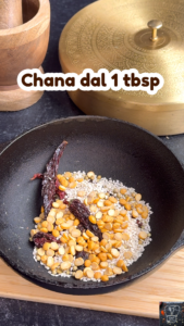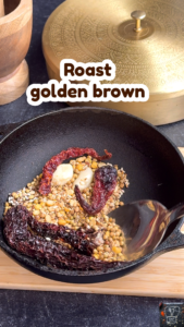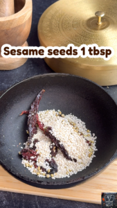 - In the same pan, roast red chillies, coriander seeds, sesame seeds, chana dal, urad dal, and cumin seeds until they change color.