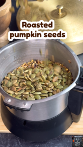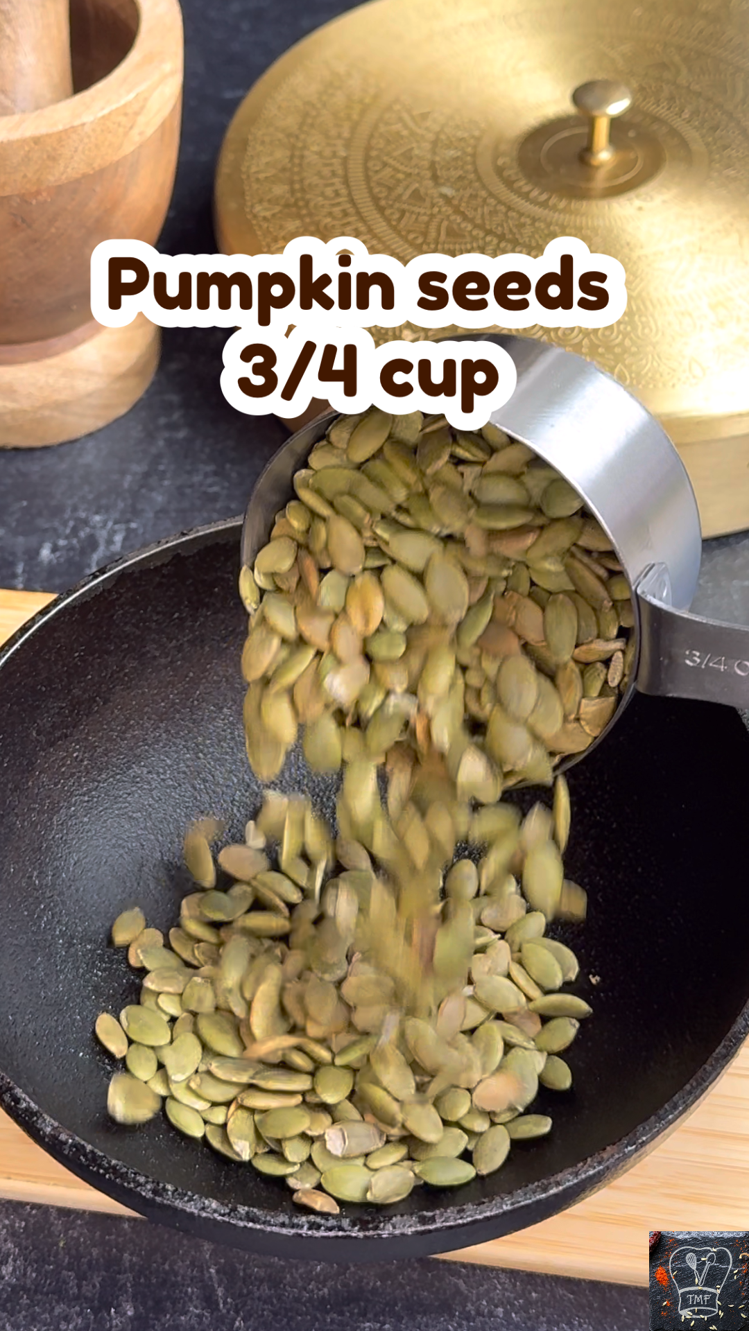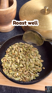 - Heat a pan and dry roast the pumpkin seeds until aromatic and slightly golden. Transfer to a plate to cool.