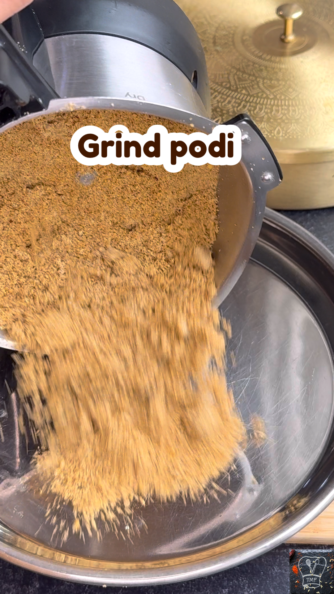I recommend pulsing the podi a few times for the perfect grainy texture. Mix well after each pulse. After the podi turns to a coarse texture, add garlic; grind it to your desired texture.