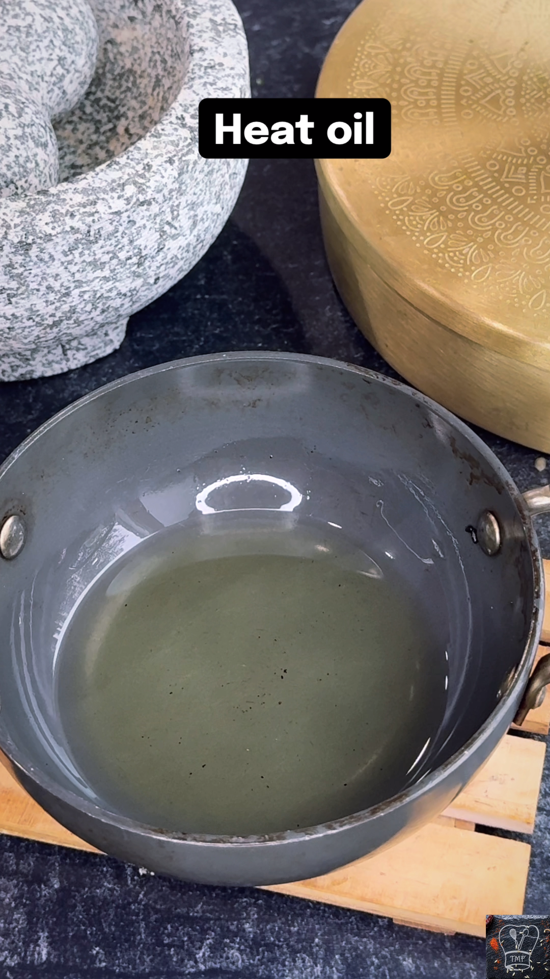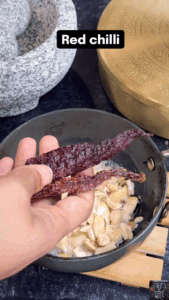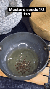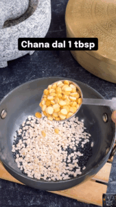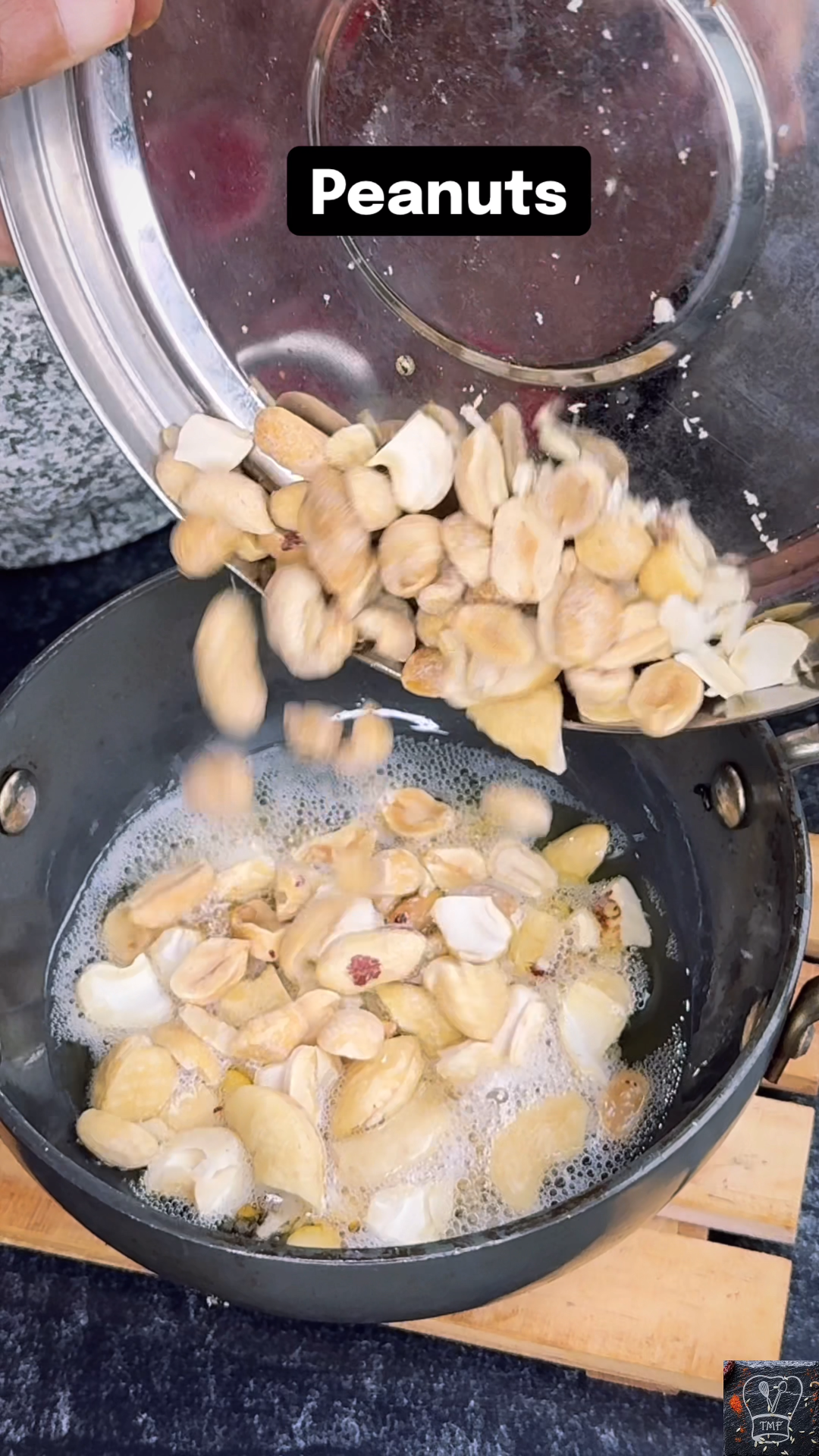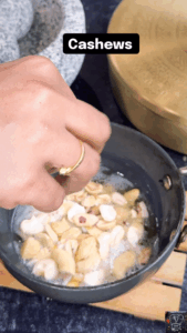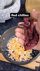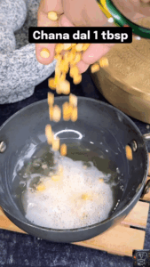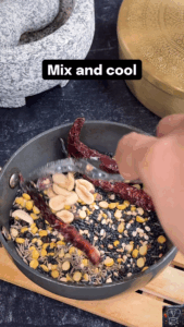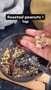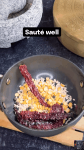 - Add mustard seeds, chana dal, urad dal, peanuts, cashews, red chillies; Fry till golden