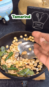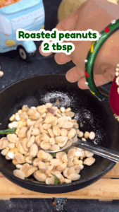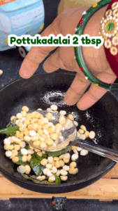 - Add pottukadalai and roasted peanuts. Sauté until aromatic. Switch off the flame