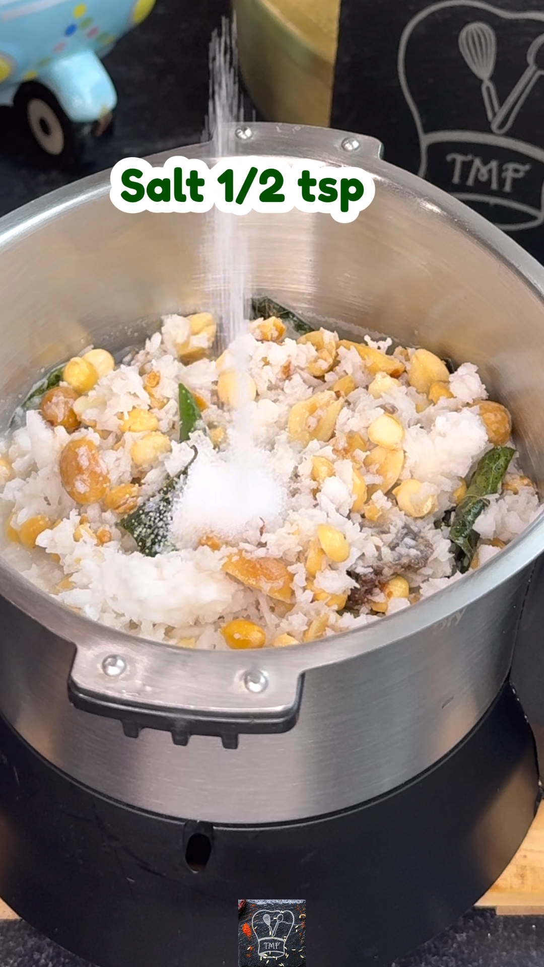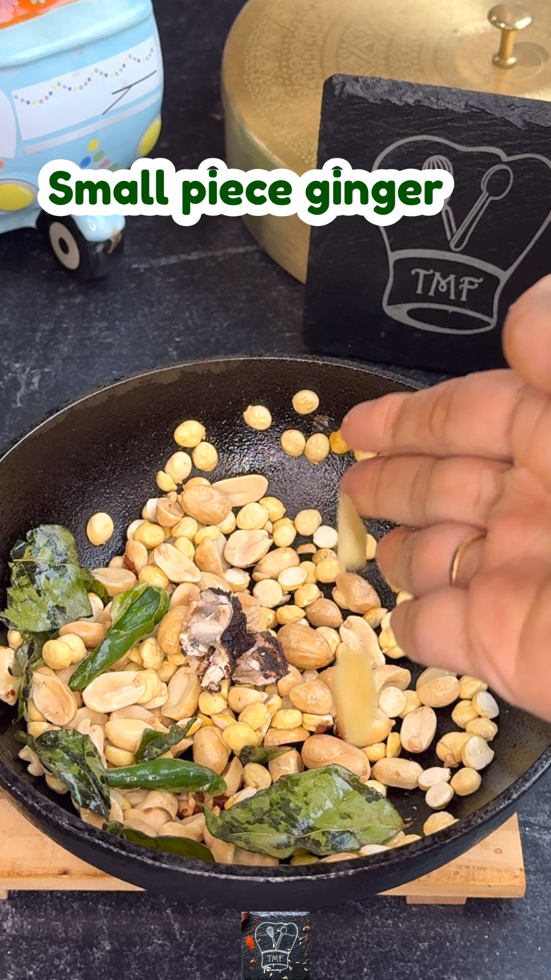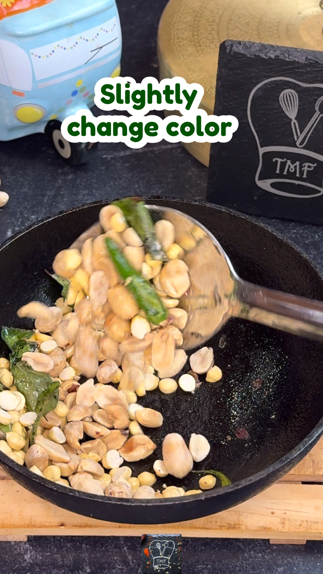 - Add pottukadalai and roasted peanuts. Sauté until aromatic. Switch off the flame