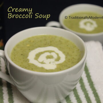 Add broccoli and potato and sauté for 2 -3 minutes. Add water and cover the lid. Cook till the vegetables are fork tender and switch off. Let it come to room temperature. Put the vegetables in a mixie/ blender along with little vegetable stock and puree them to a smooth texture. Keep the remaining vegetable stock in the pan